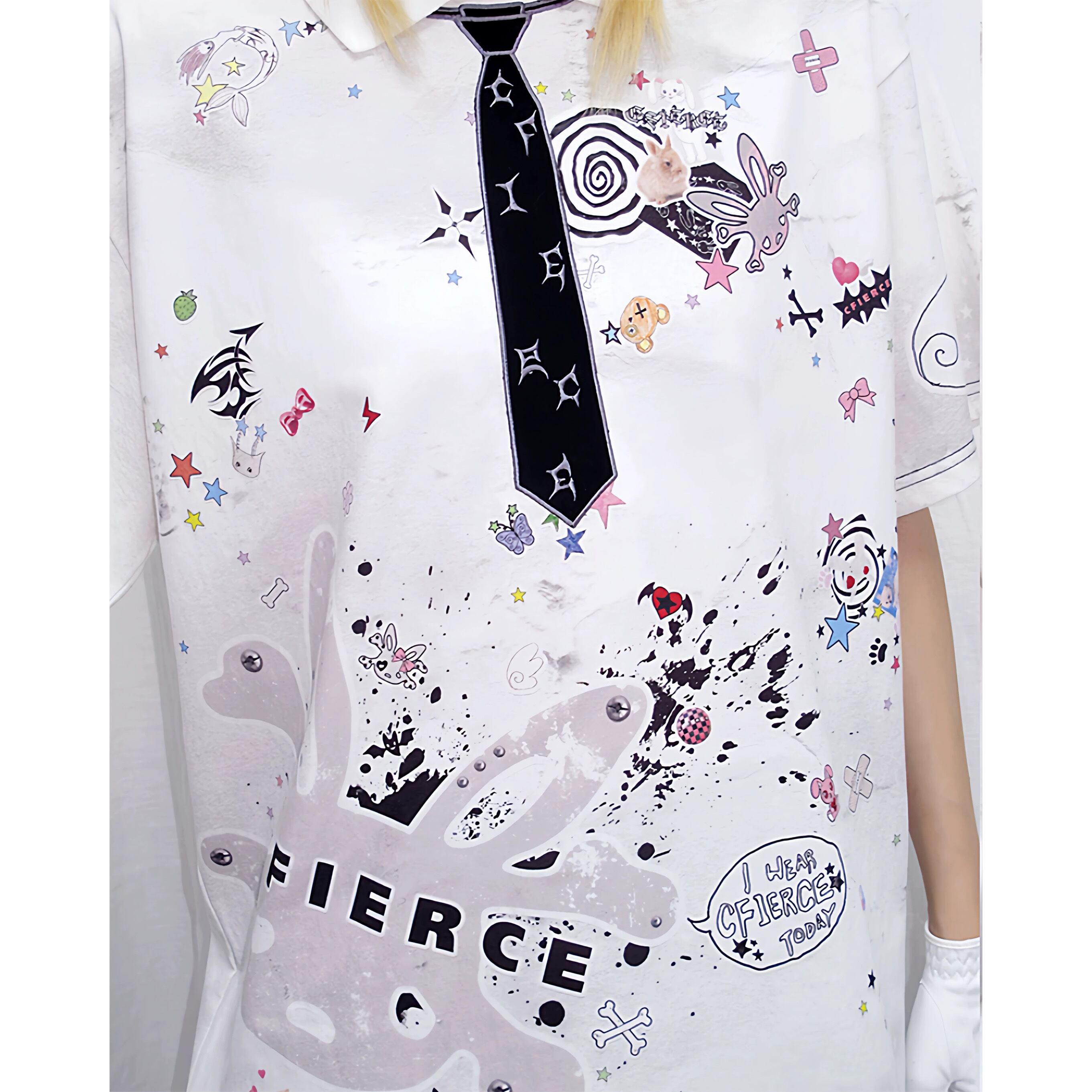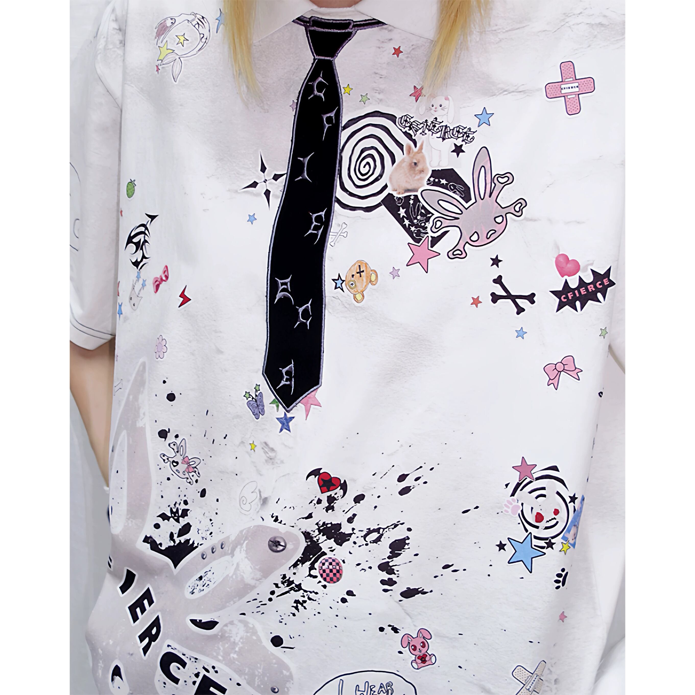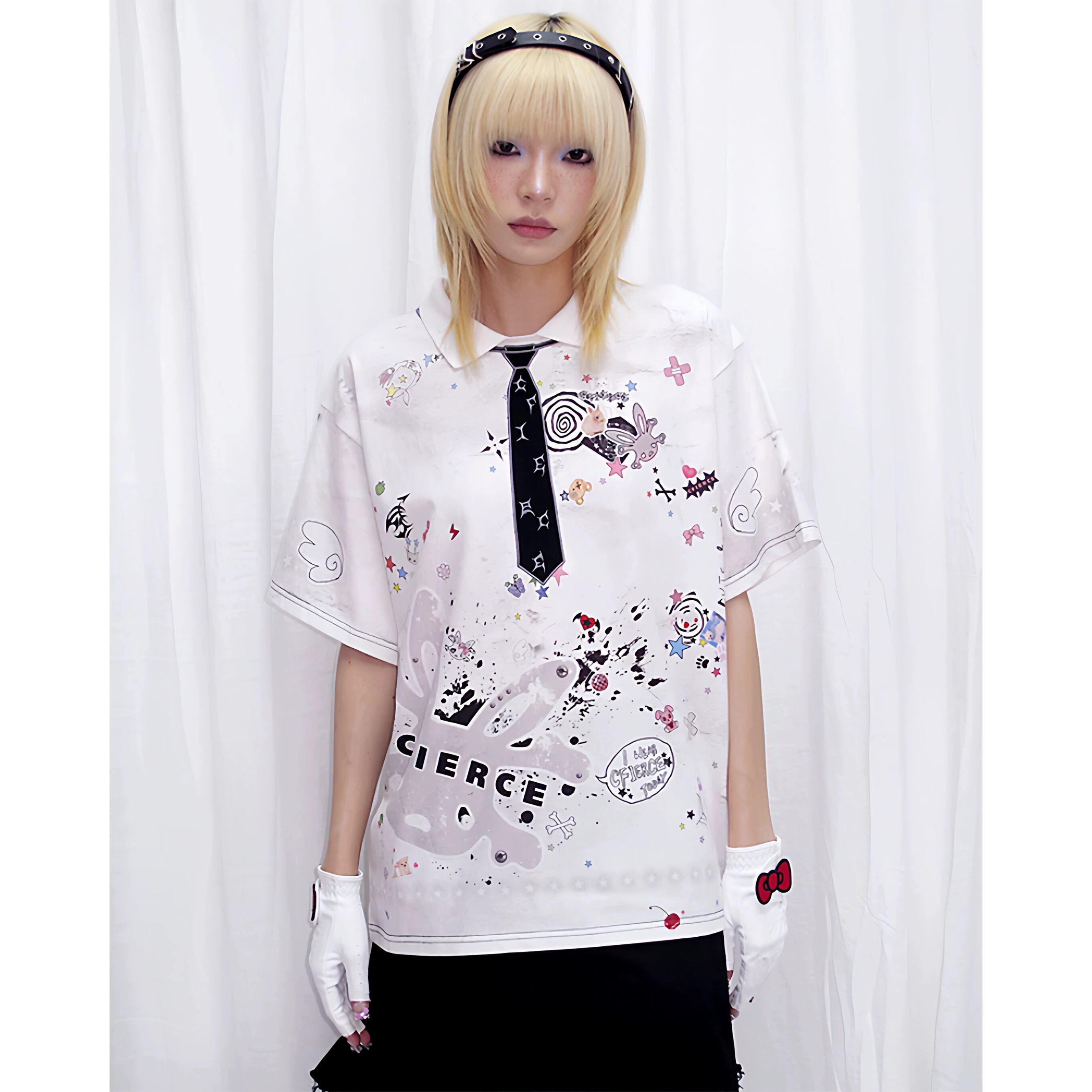[CFIERCE] Sticker Print Embroidered Tie Polo Shirt