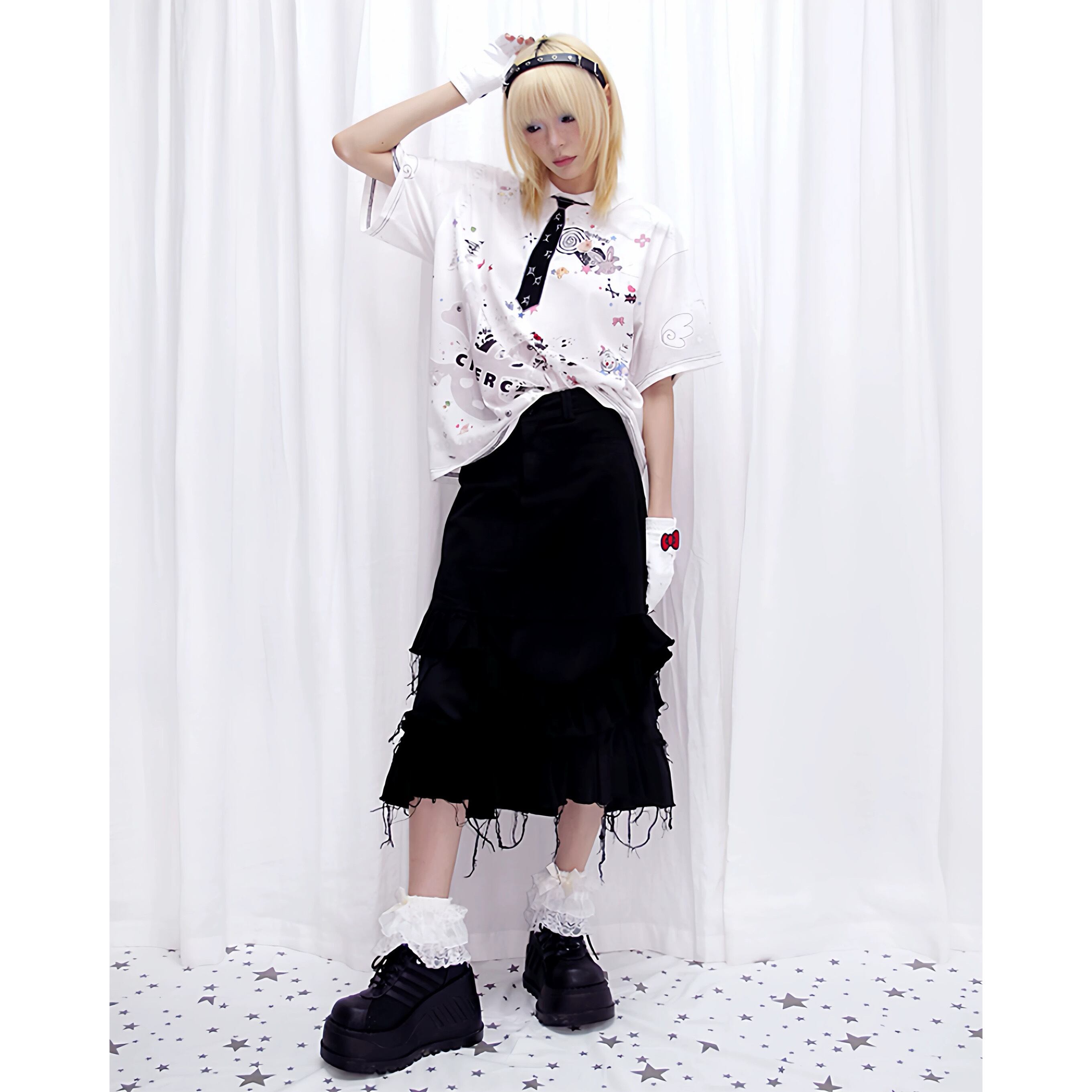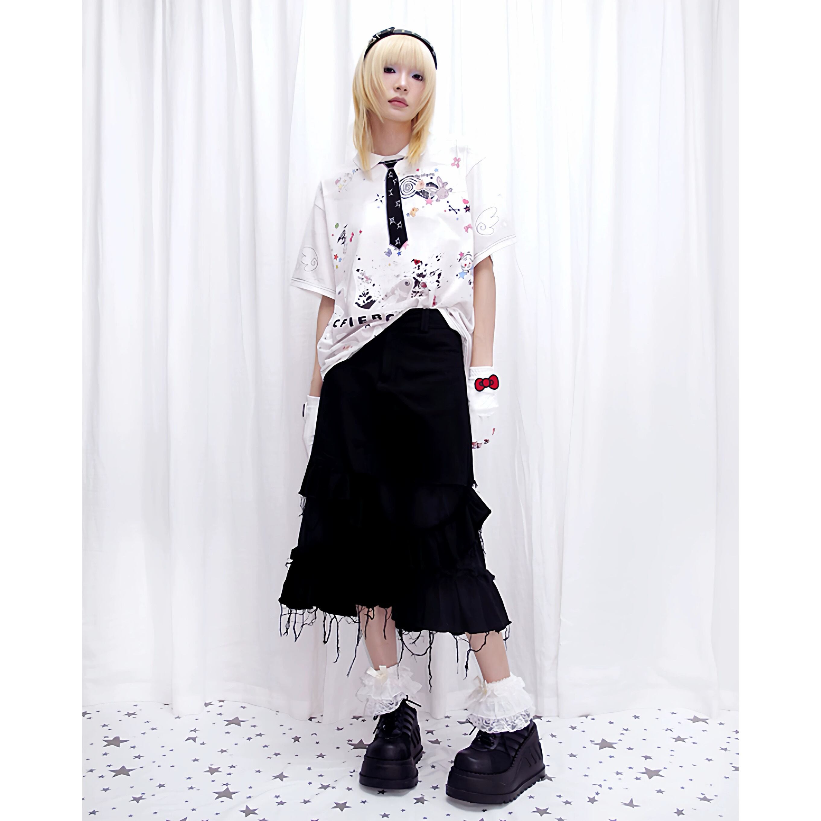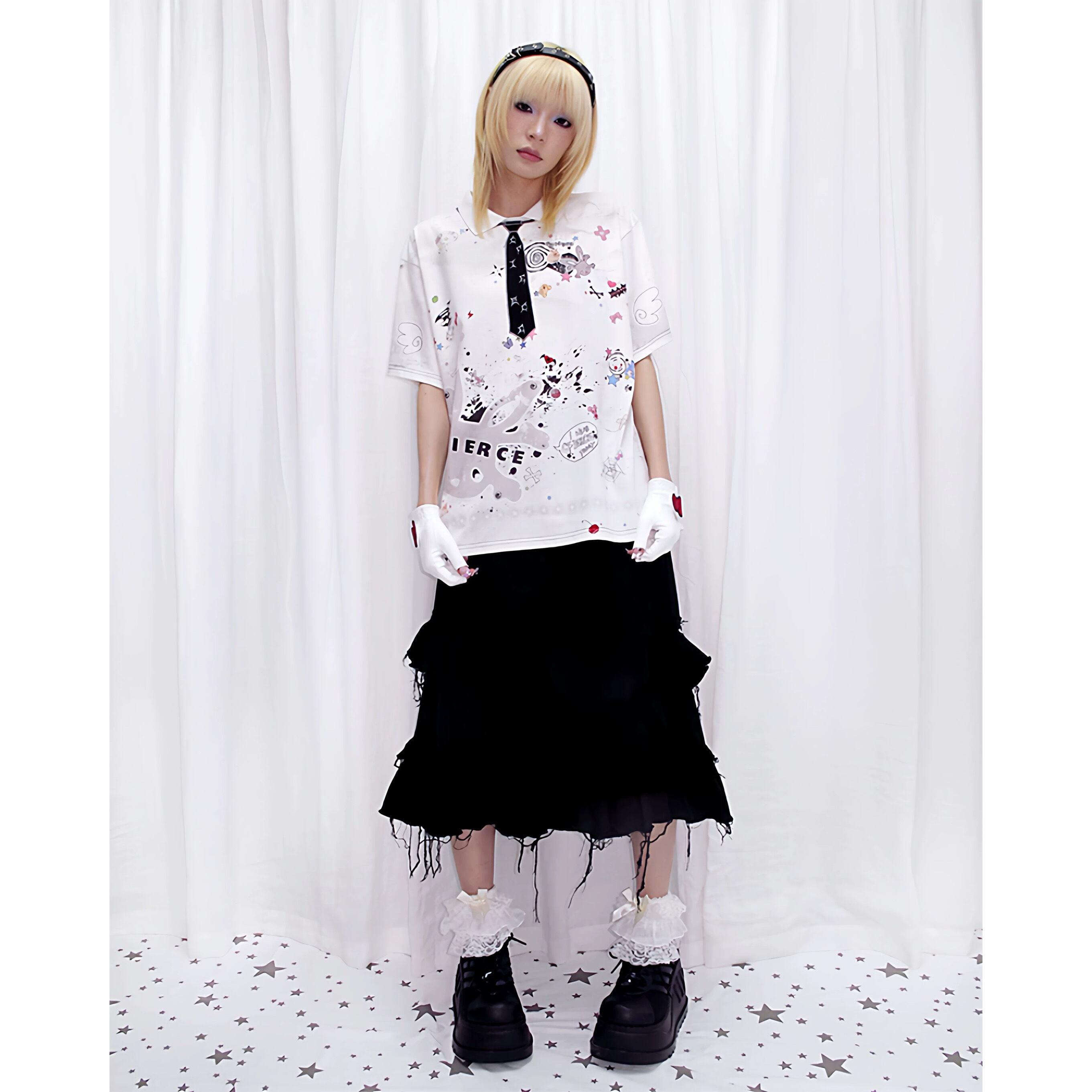 [CFIERCE] Sticker Print Embroidered Tie Polo Shirt