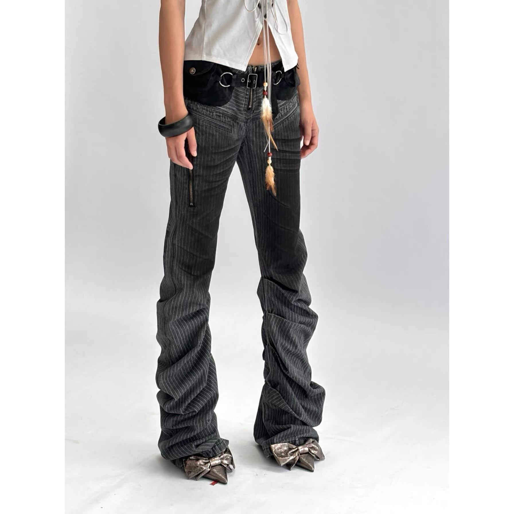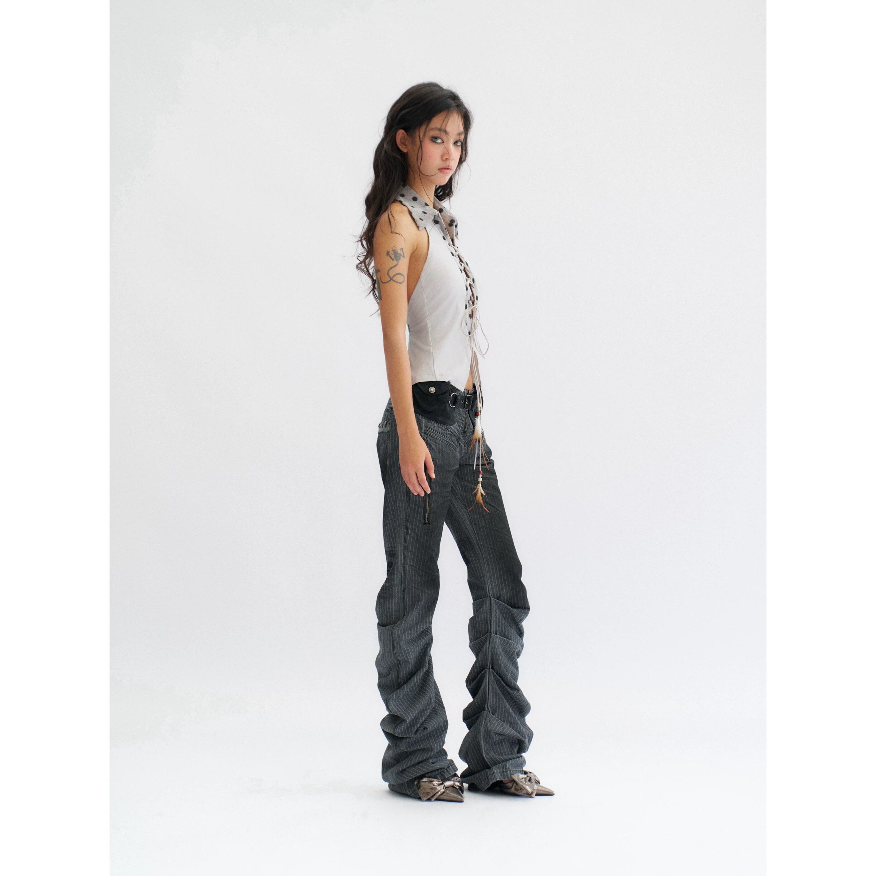 【request】Gray Stripe Leather Waist Bag Denim Pants