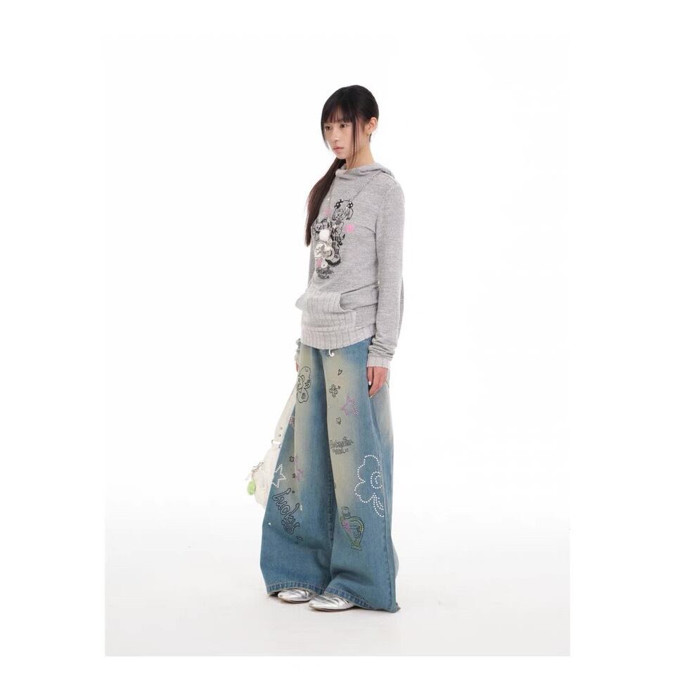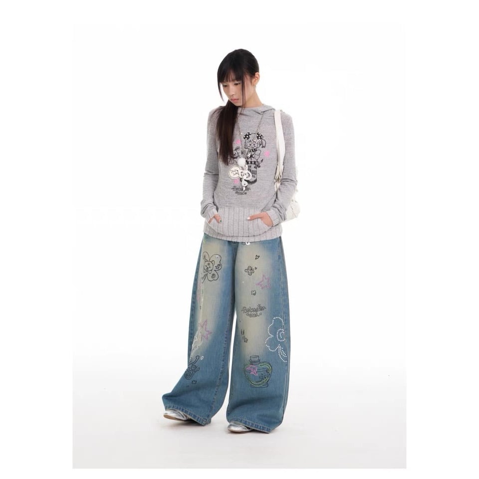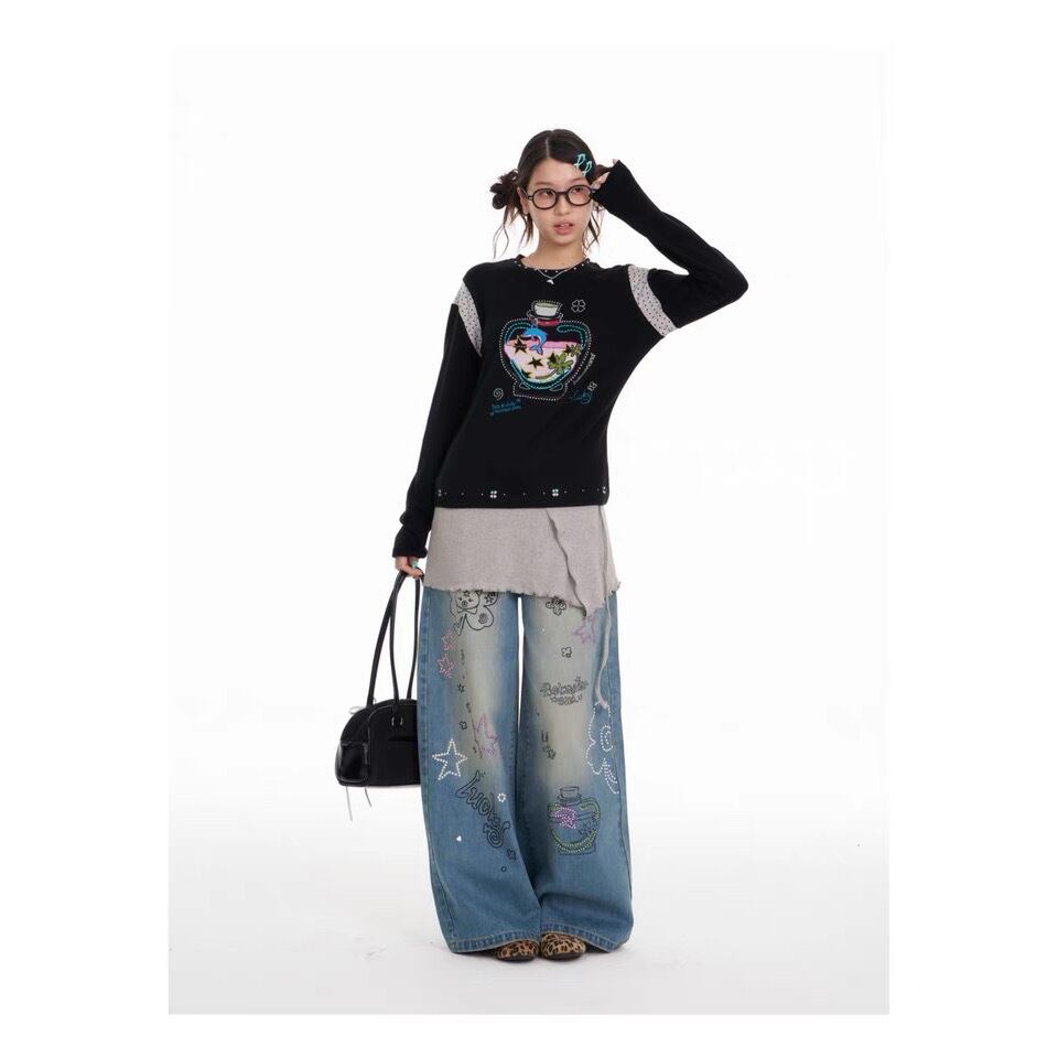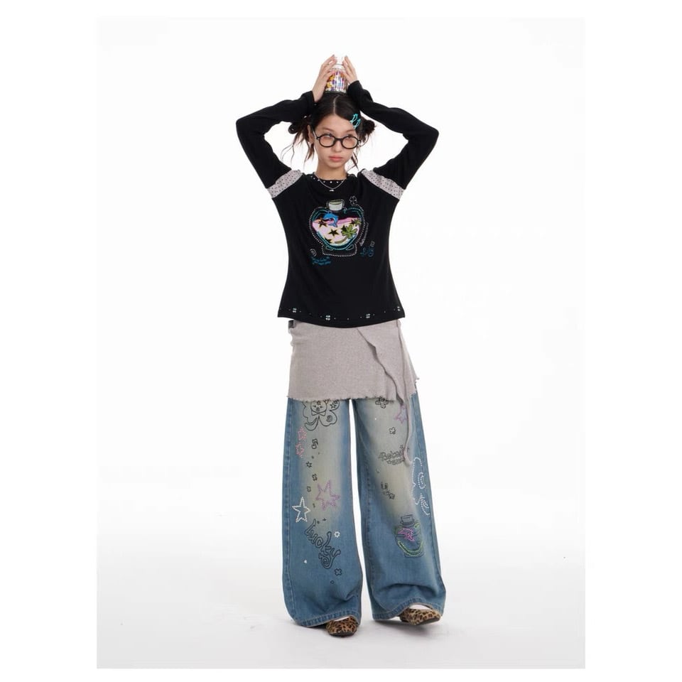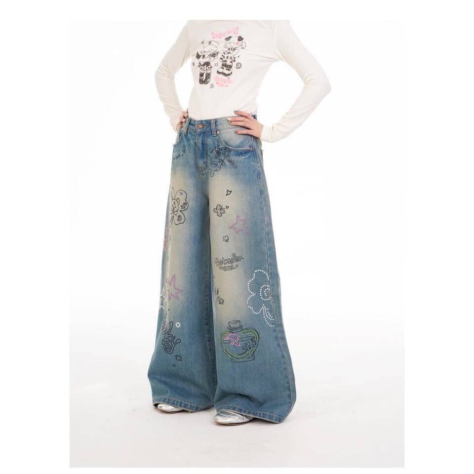 [BETWEENAND] Graffiti Illustration Embroidered Jeans