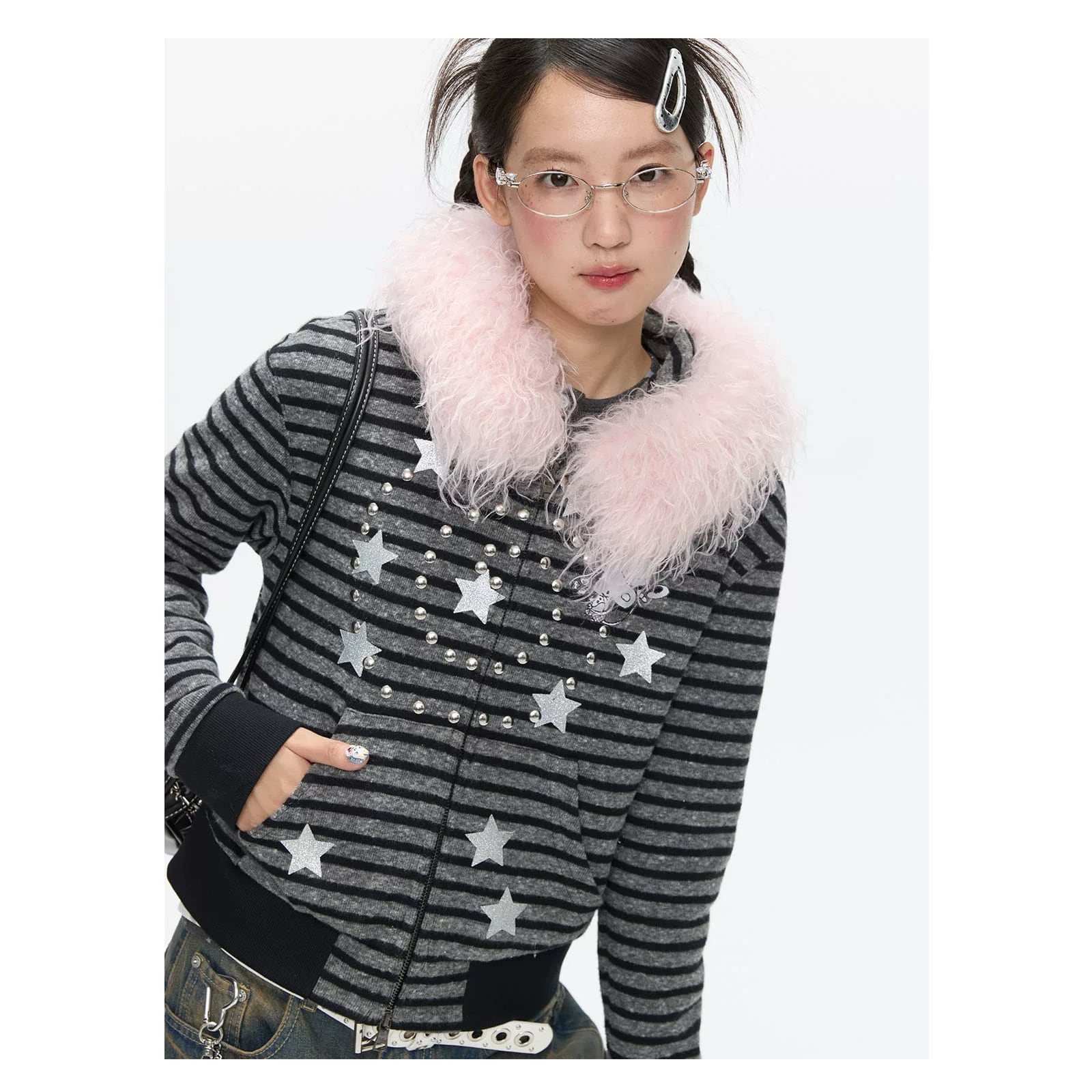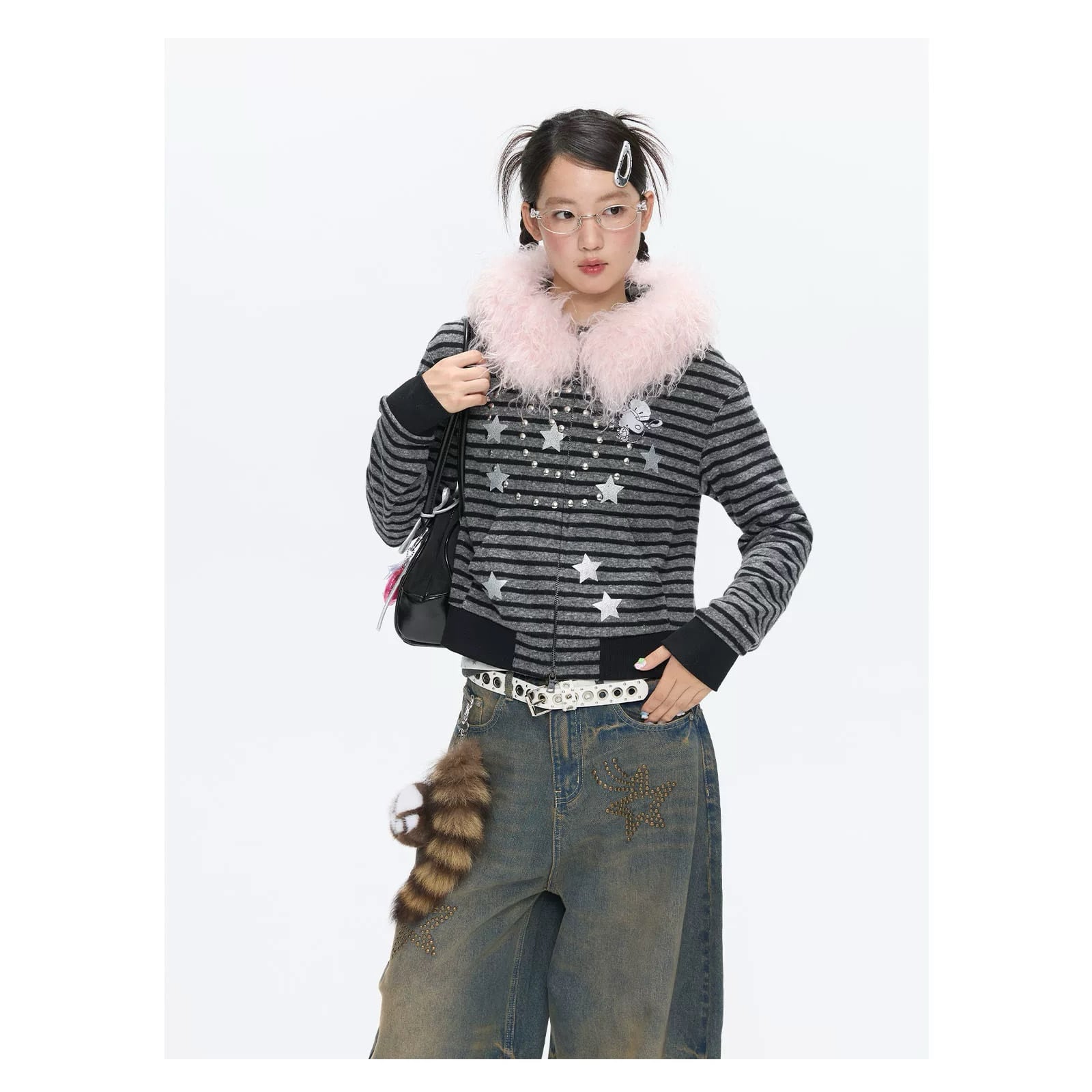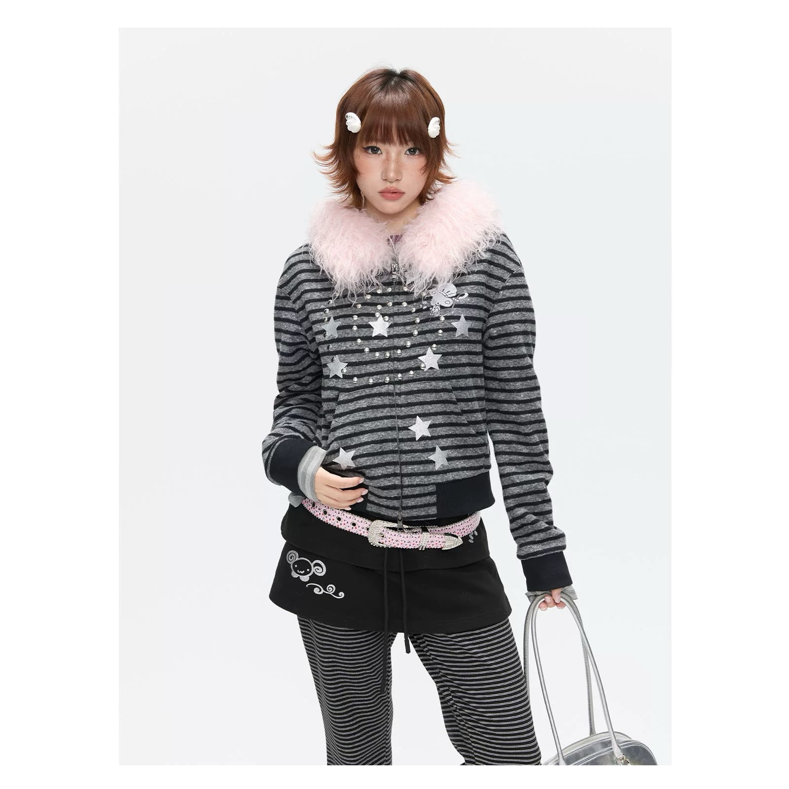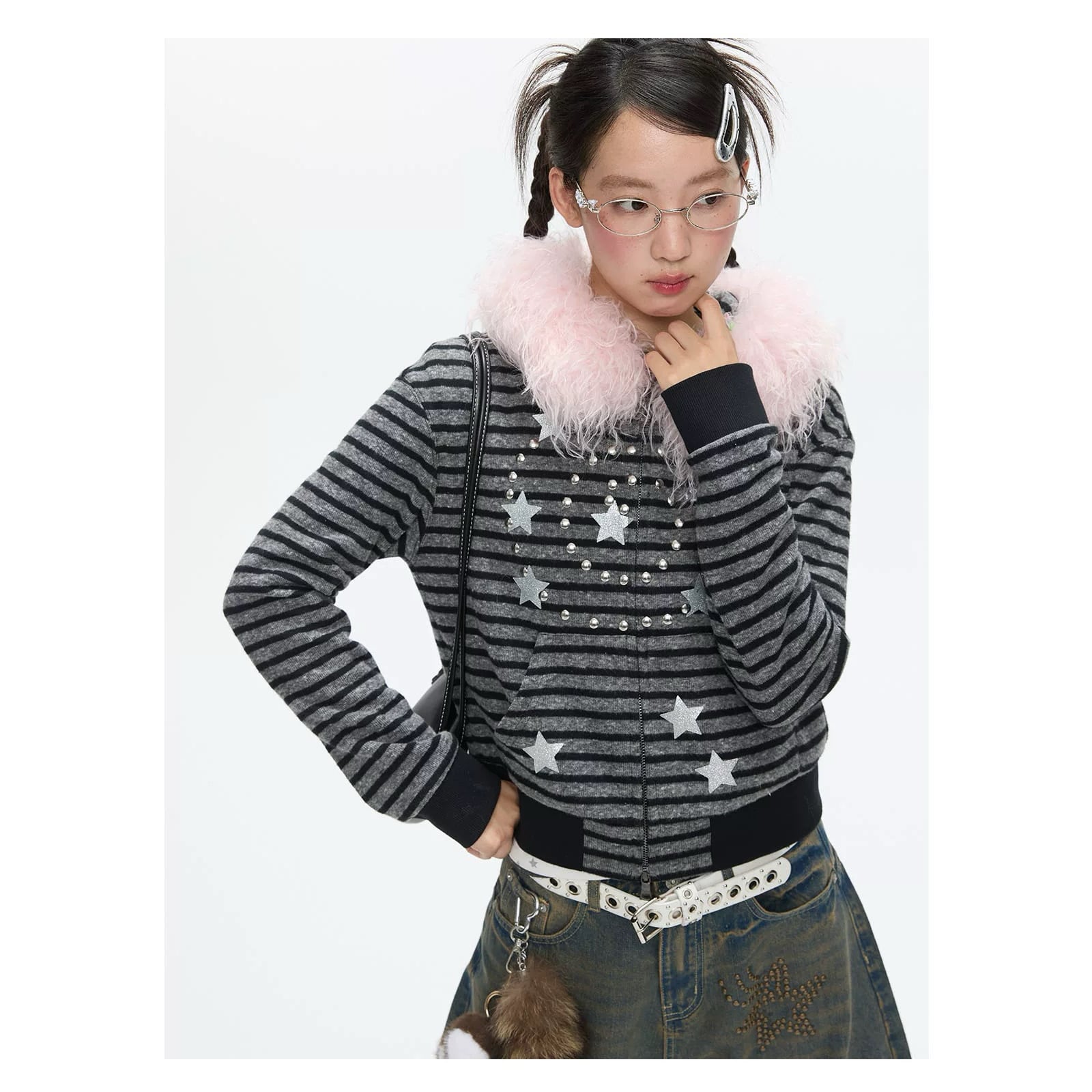 [BETWEENAND] Striped Sparkling Star Pink Fur Hoodie