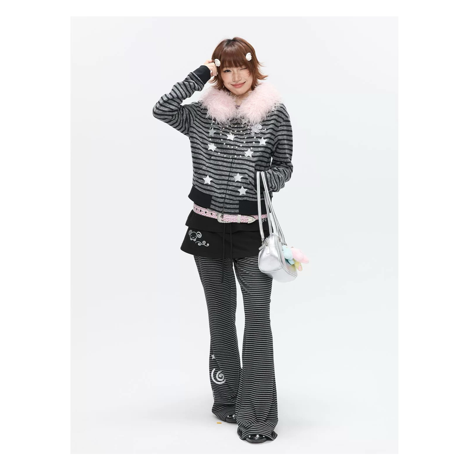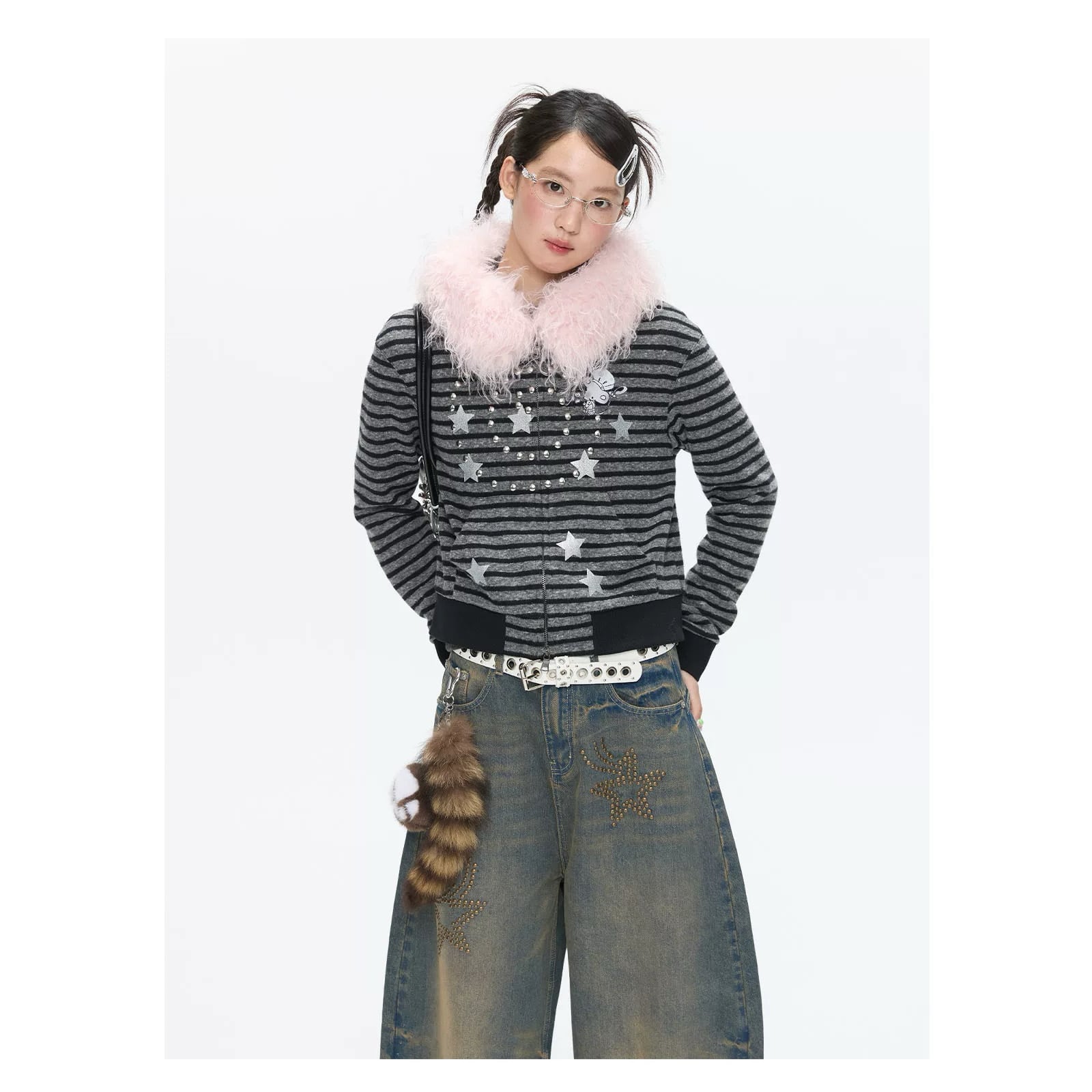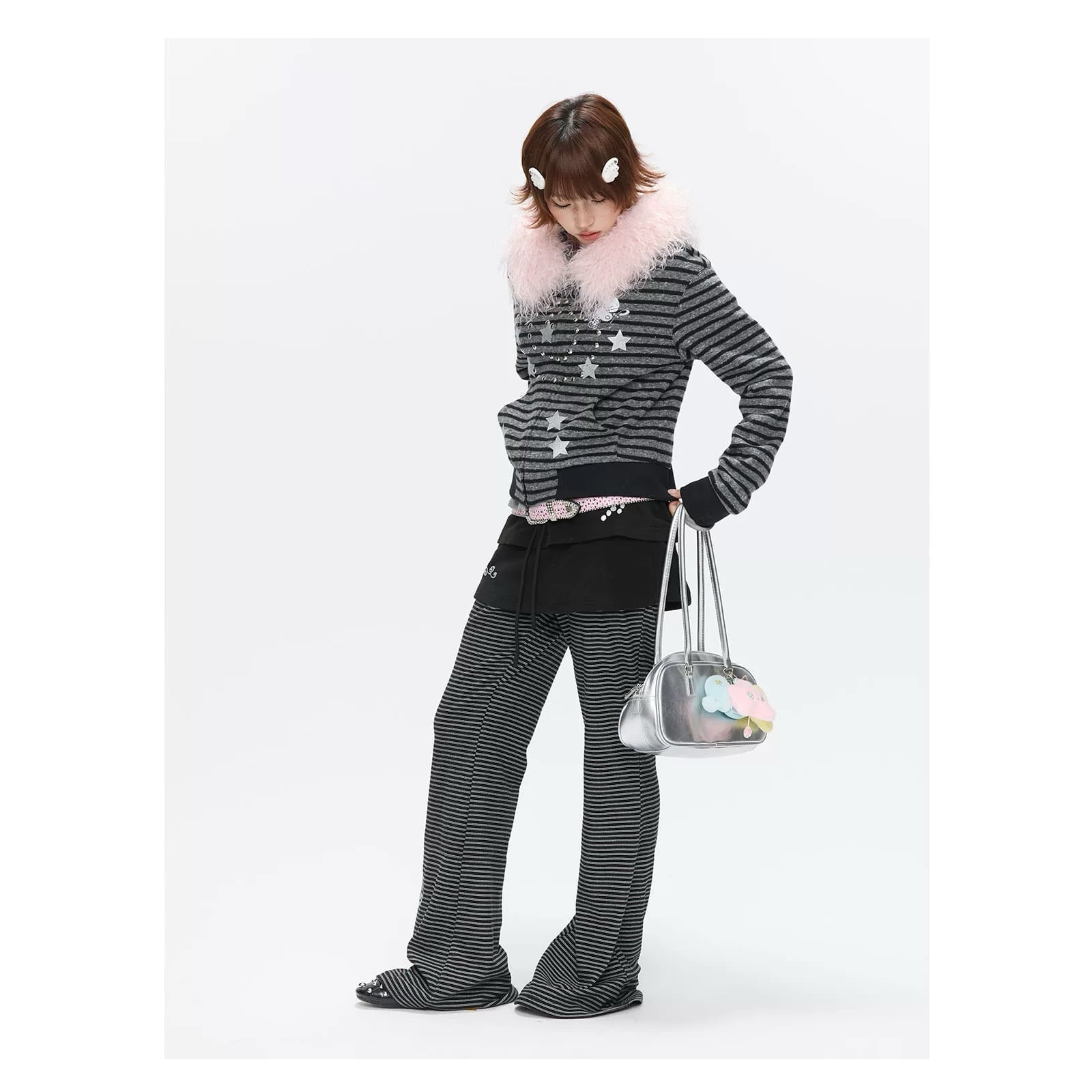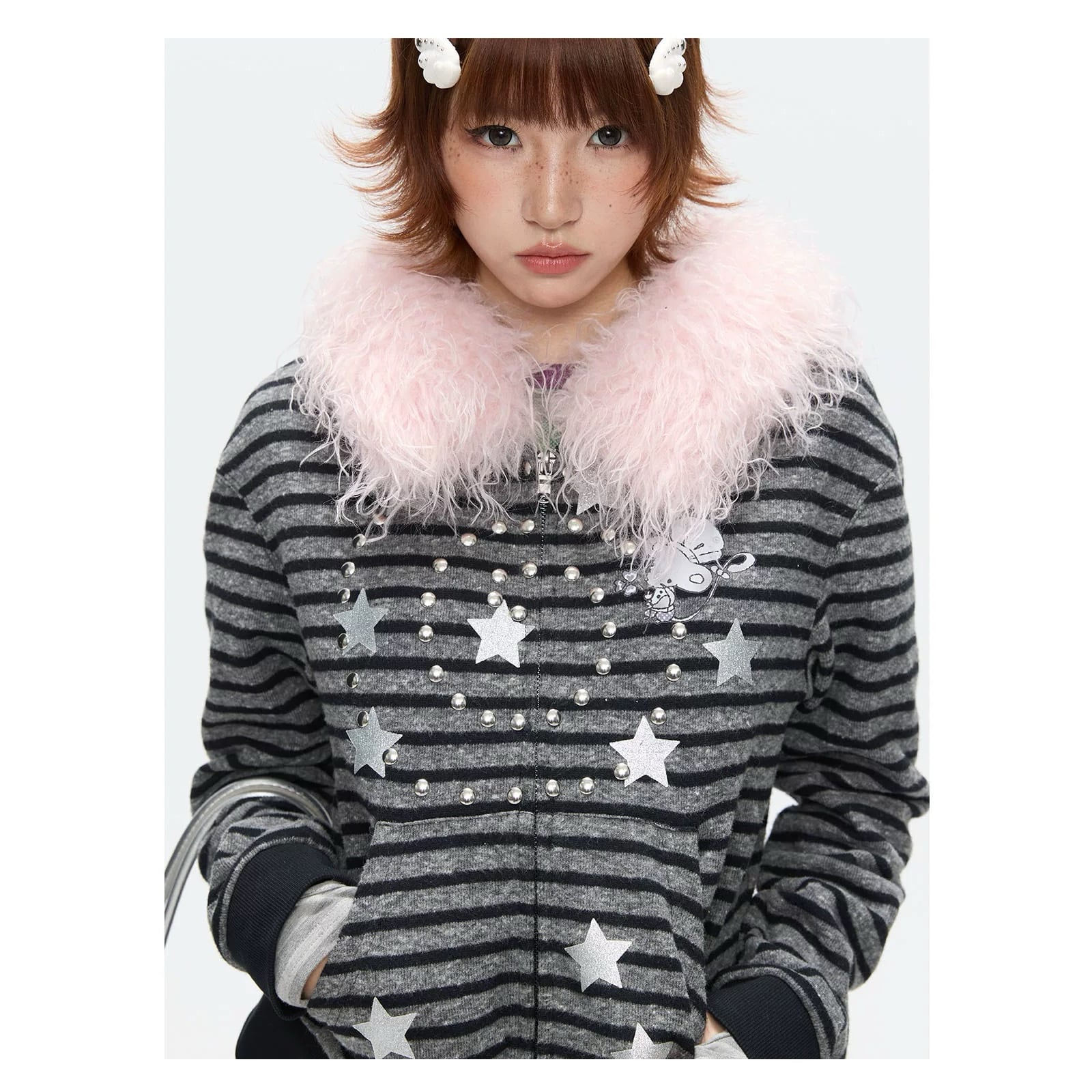 [BETWEENAND] Striped Sparkling Star Pink Fur Hoodie