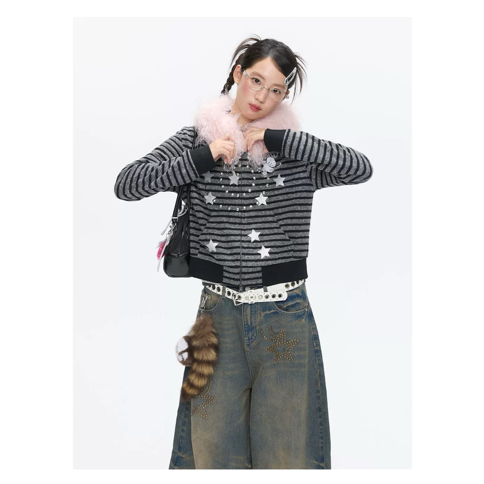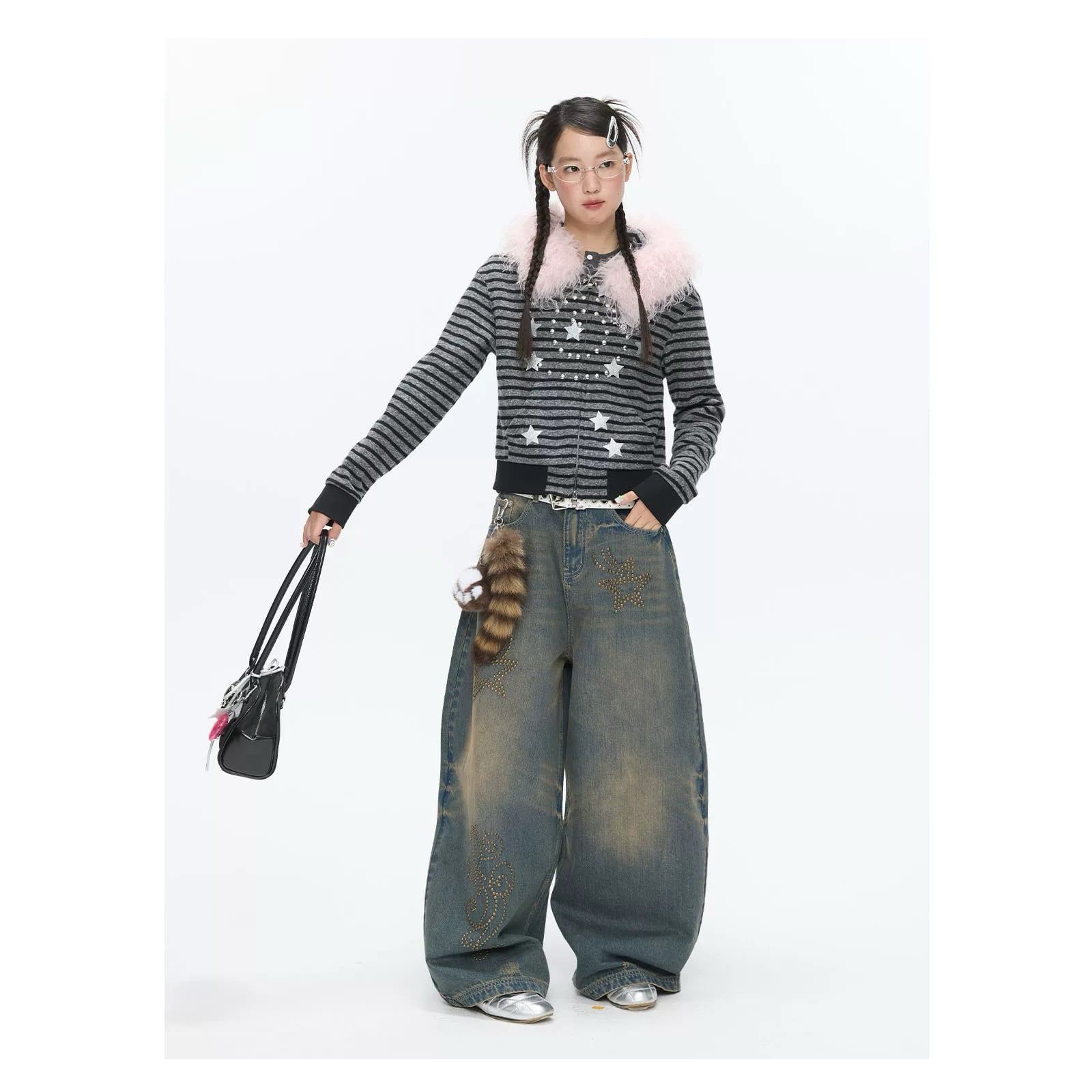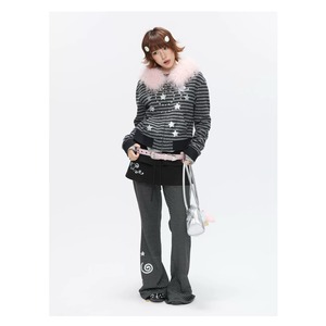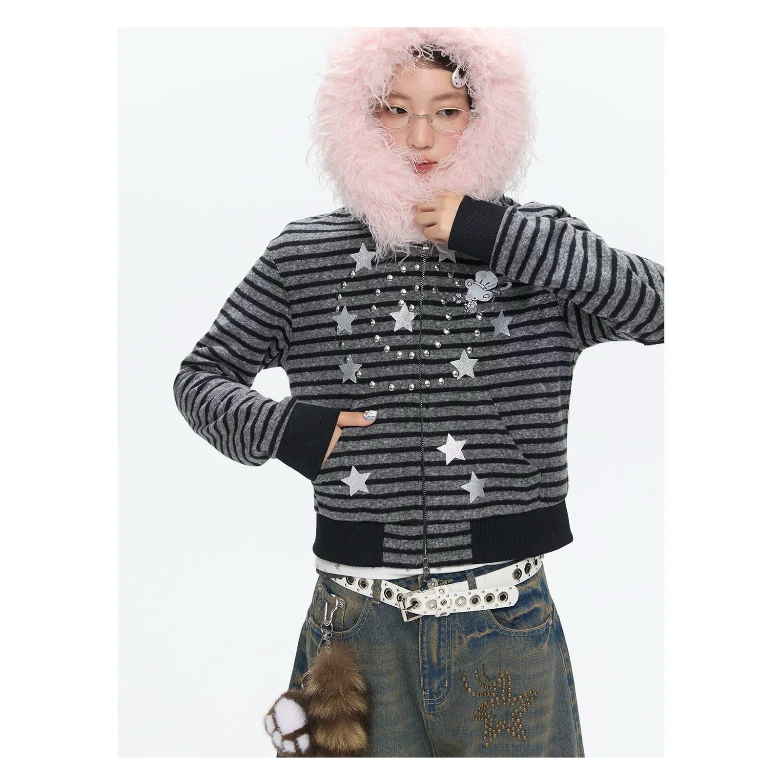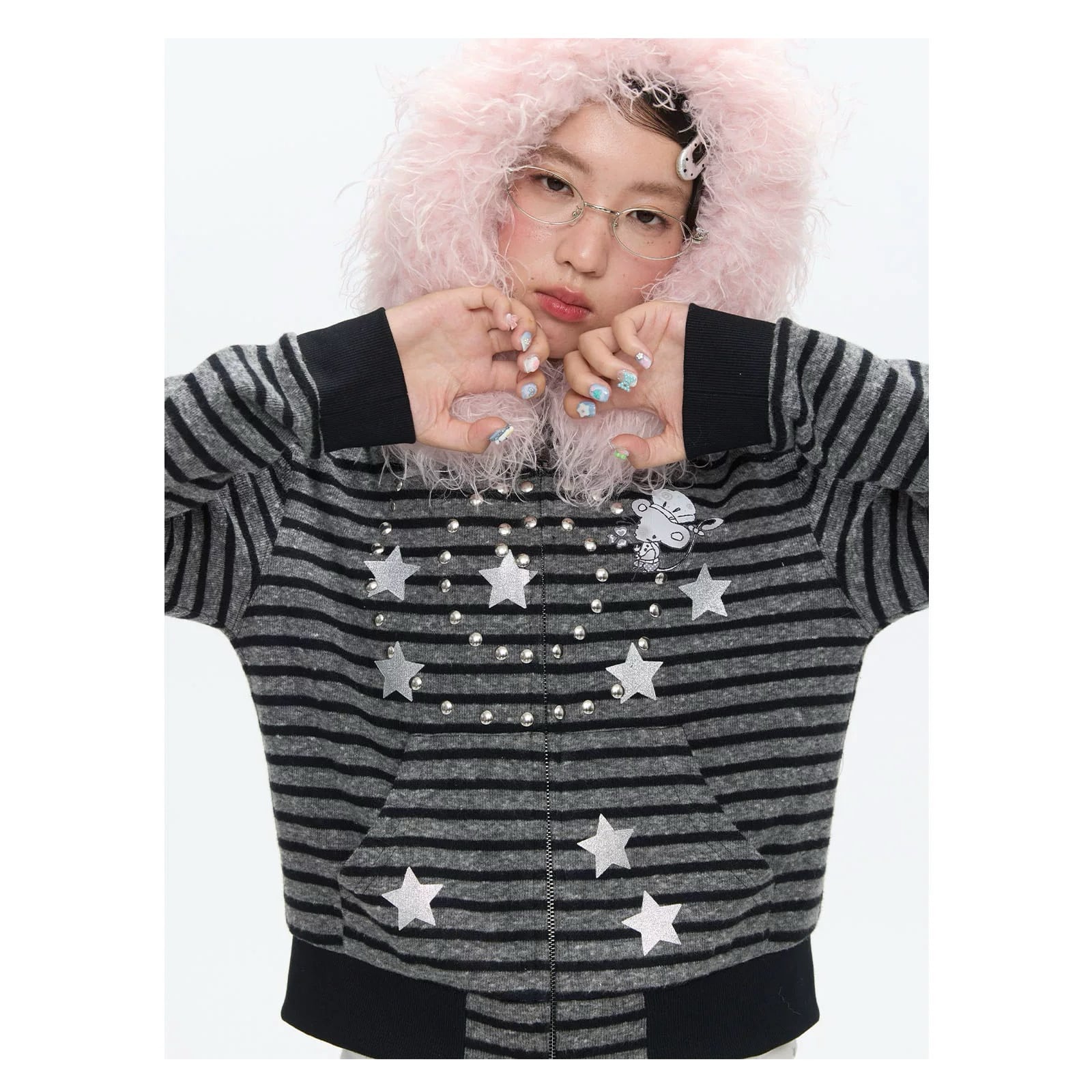 [BETWEENAND] Striped Sparkling Star Pink Fur Hoodie
