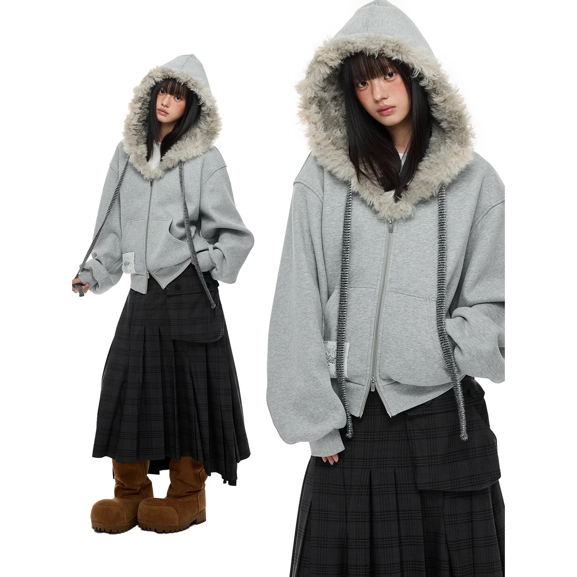 [JIKOO] gray fur collar hooded outer