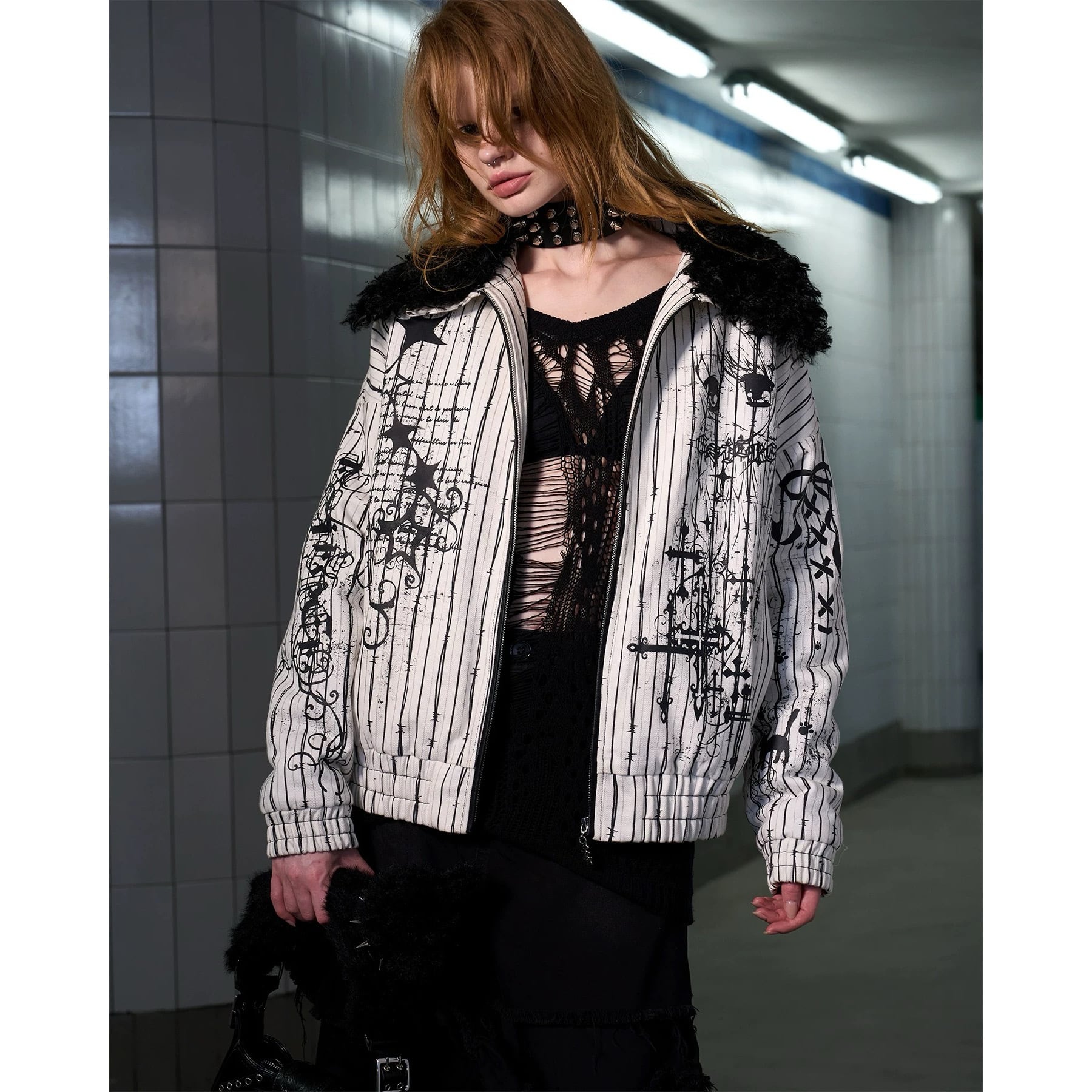 [CFIERCE] Thorn Stripe Angel Girl Fur Collar Jacket