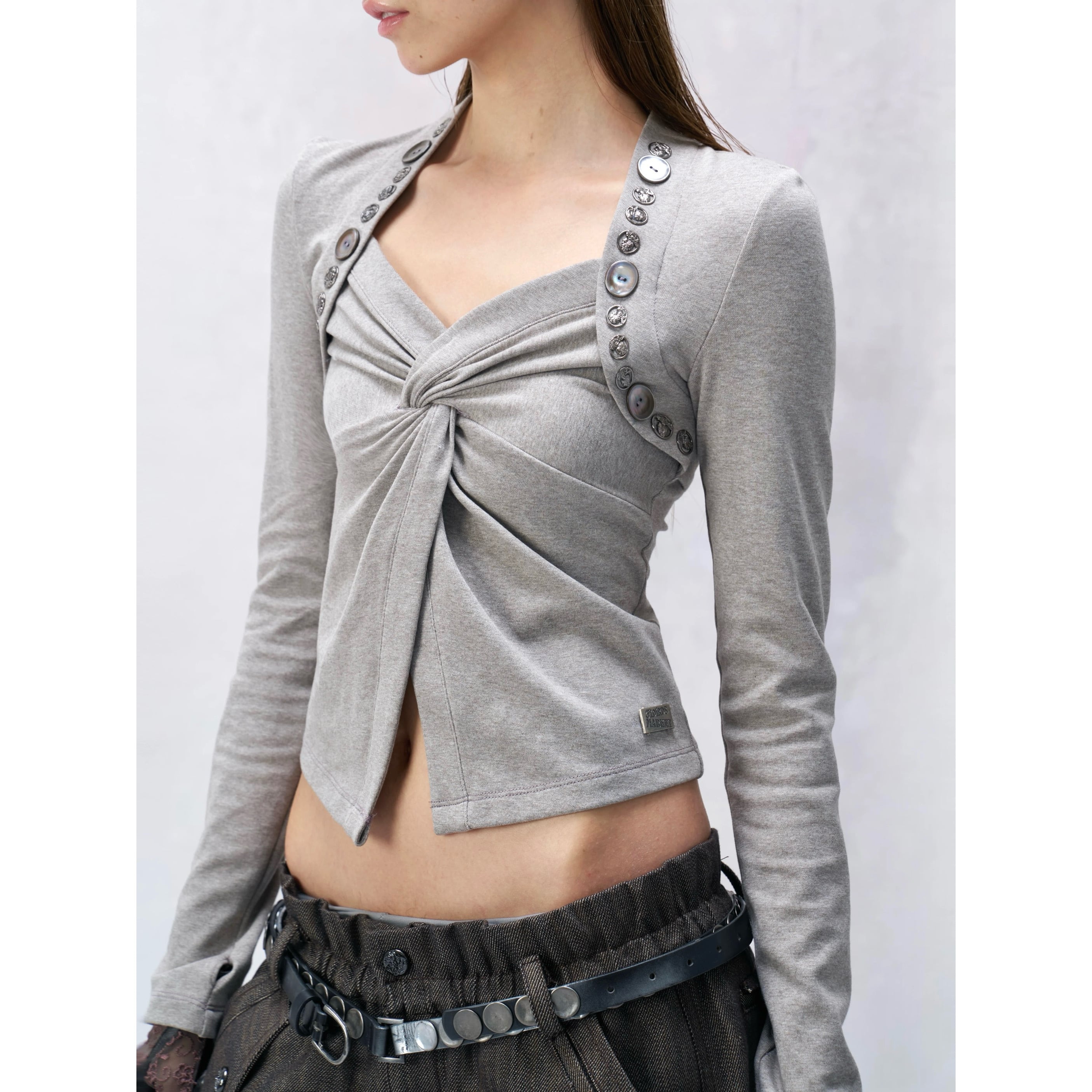 [Flowers birds market] Fake Two-Piece Gray V-Neck Short Top