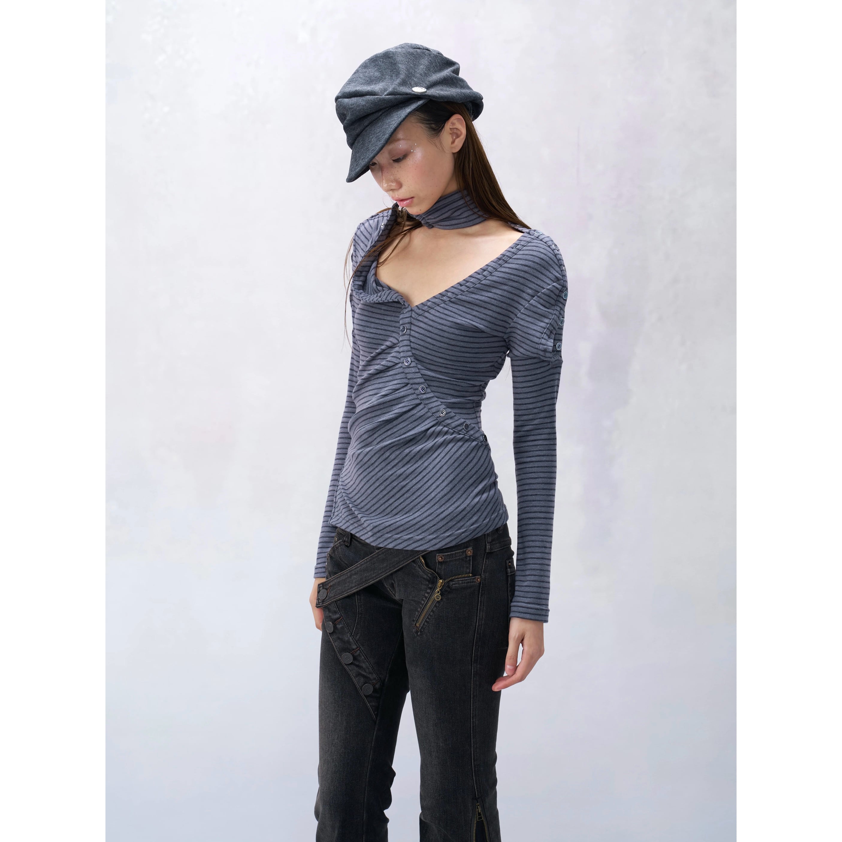 [Flowers birds market] Multiple Buttons Off-Shoulder Striped Top