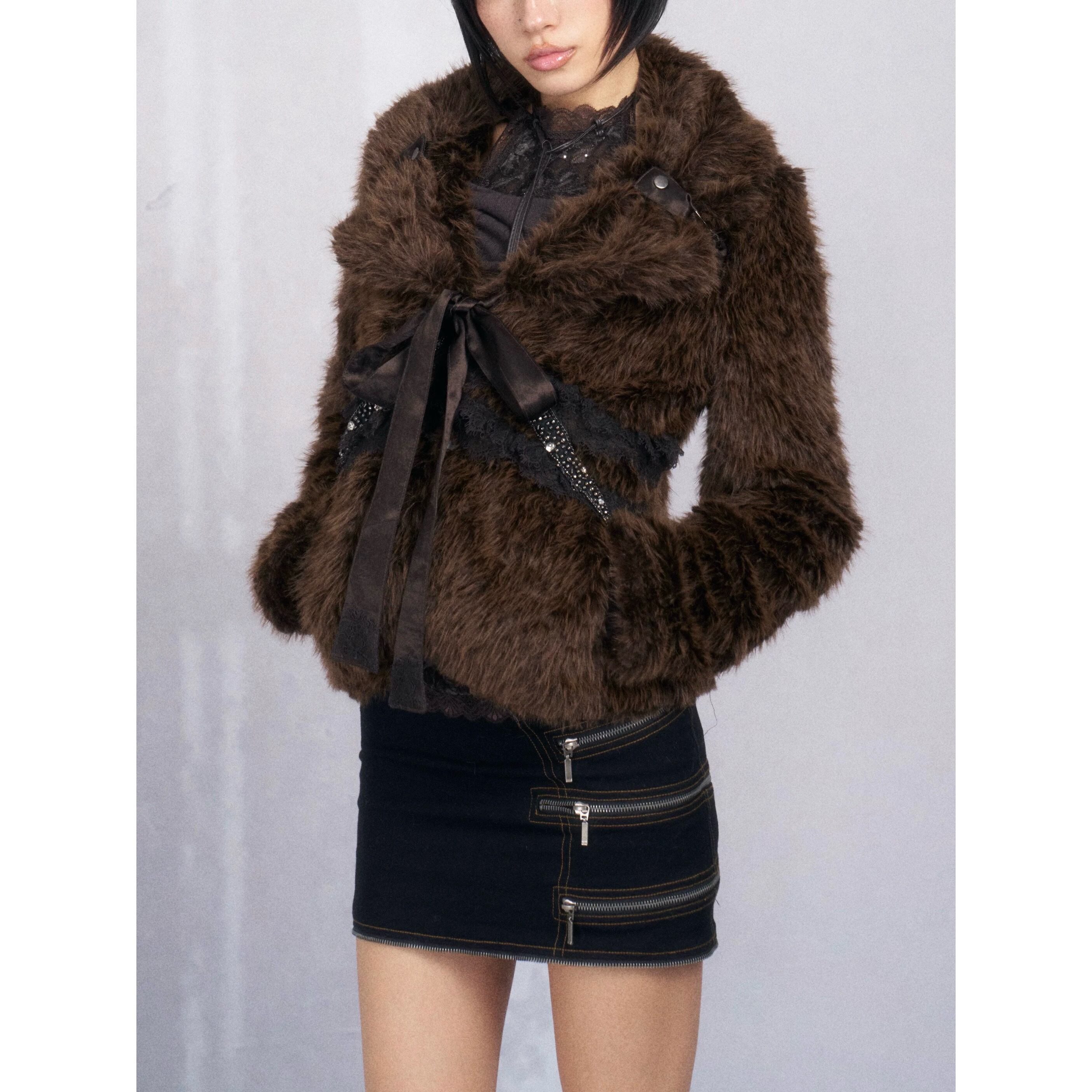 [OPEN AESTHETIC] Lace Diamond Brown Fur Jacket