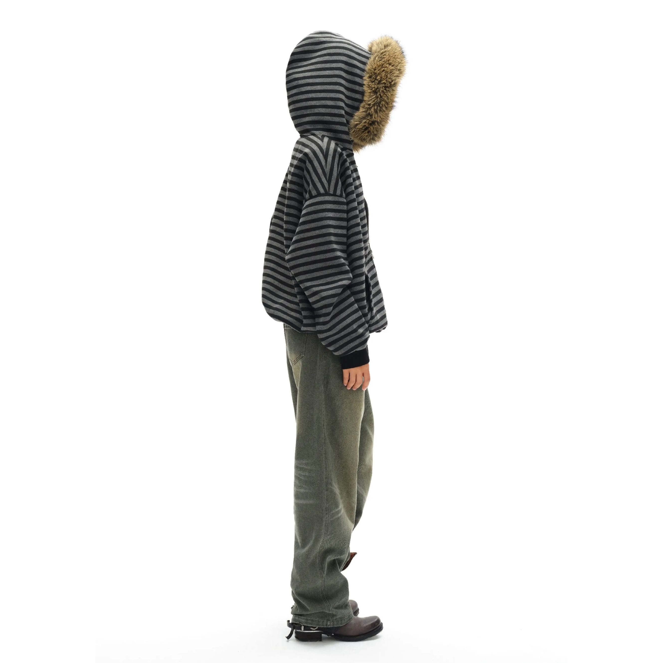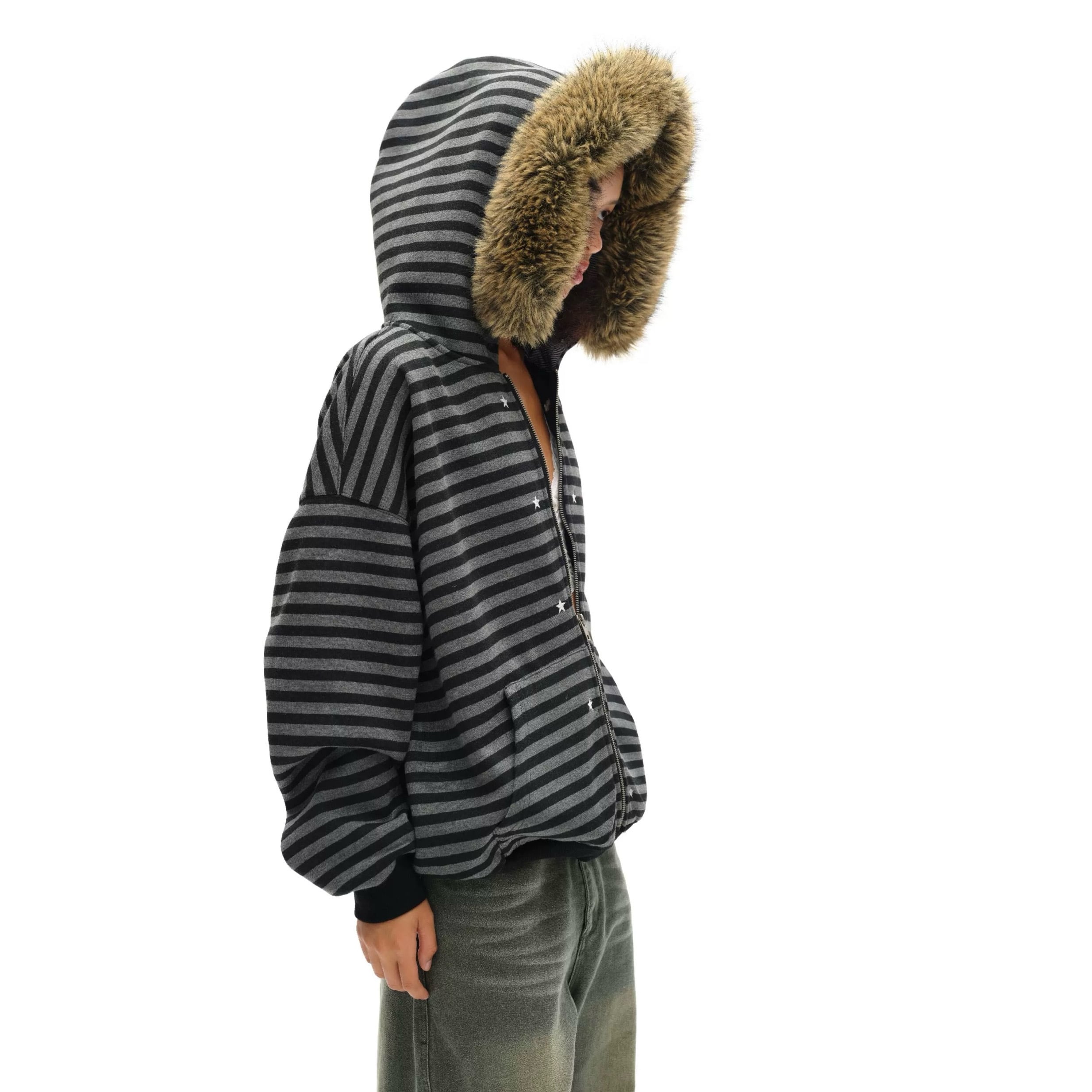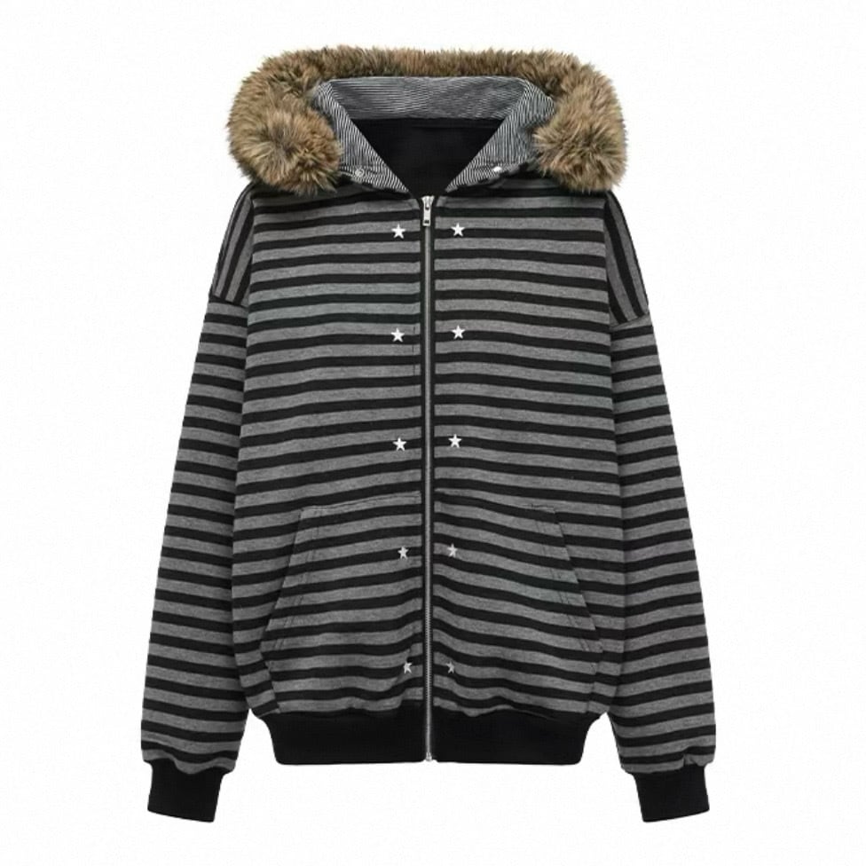 [oinimi] black-gray striped fur collar hoodie