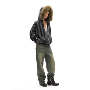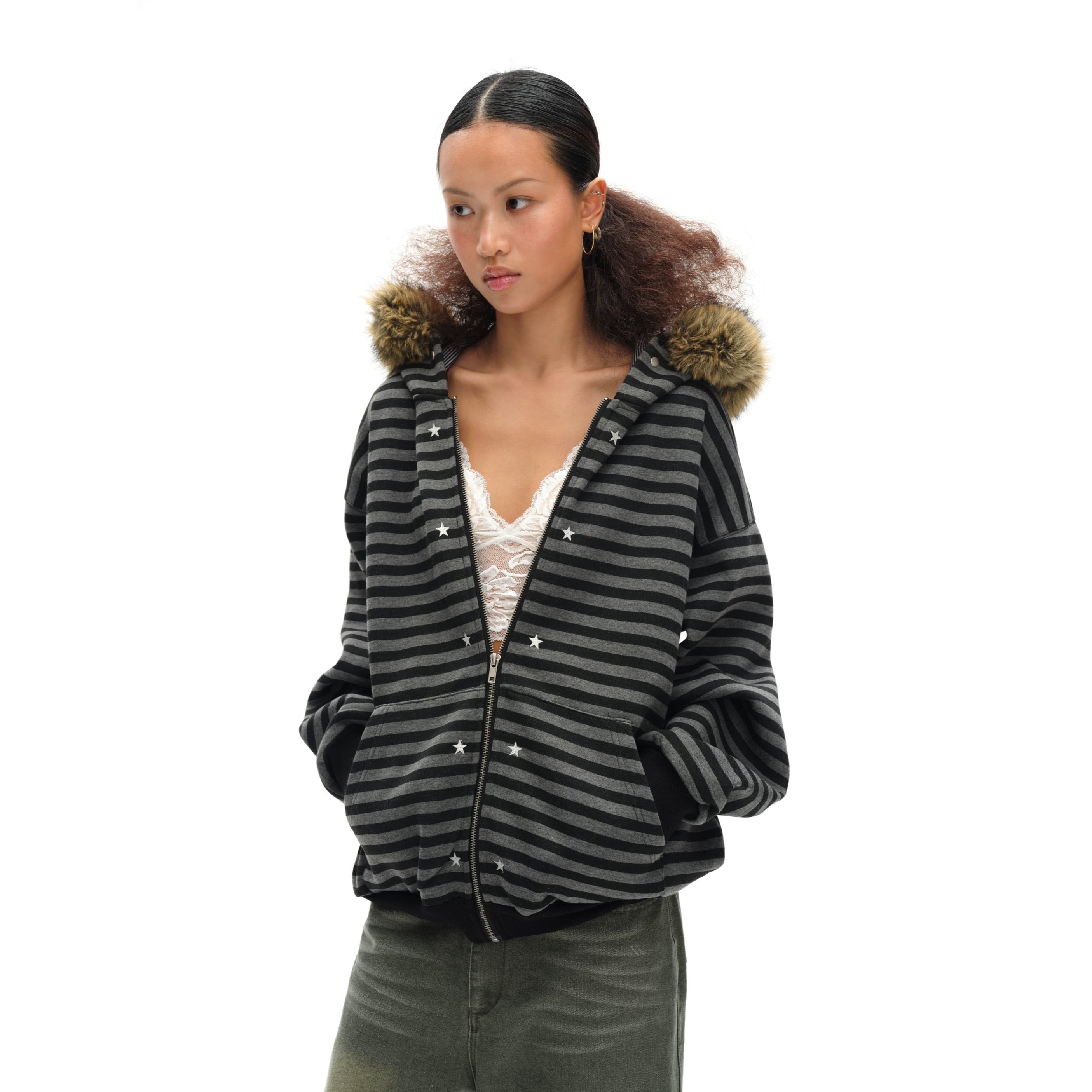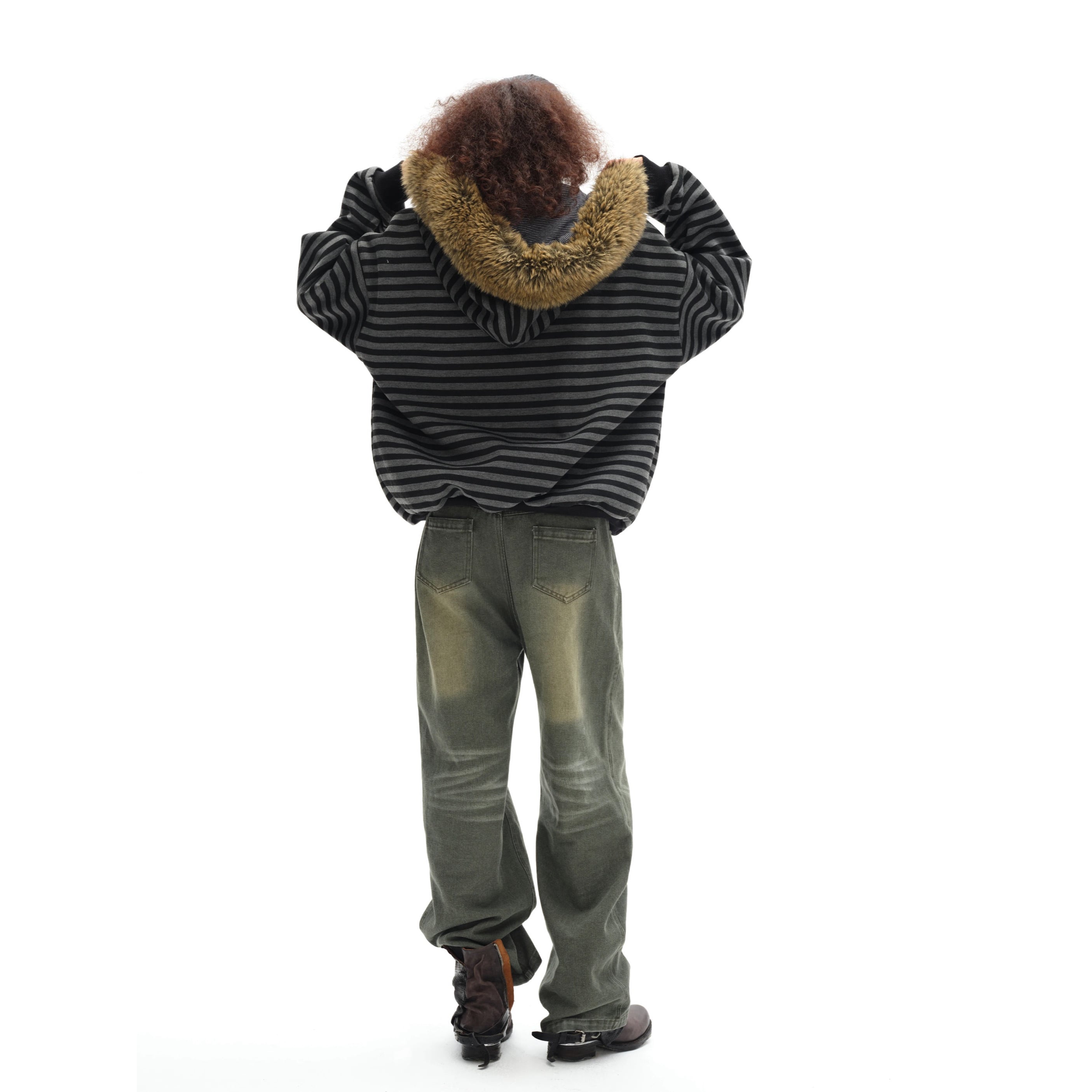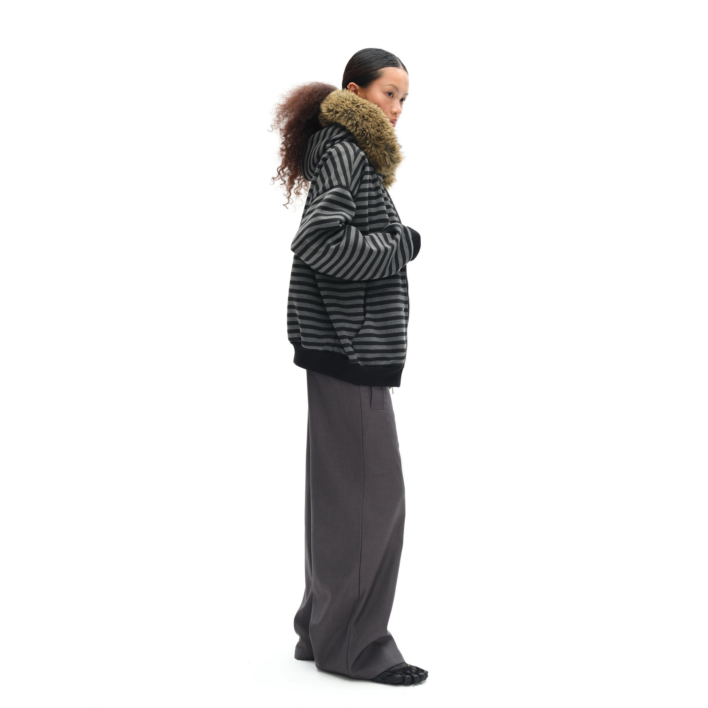 [oinimi] black-gray striped fur collar hoodie