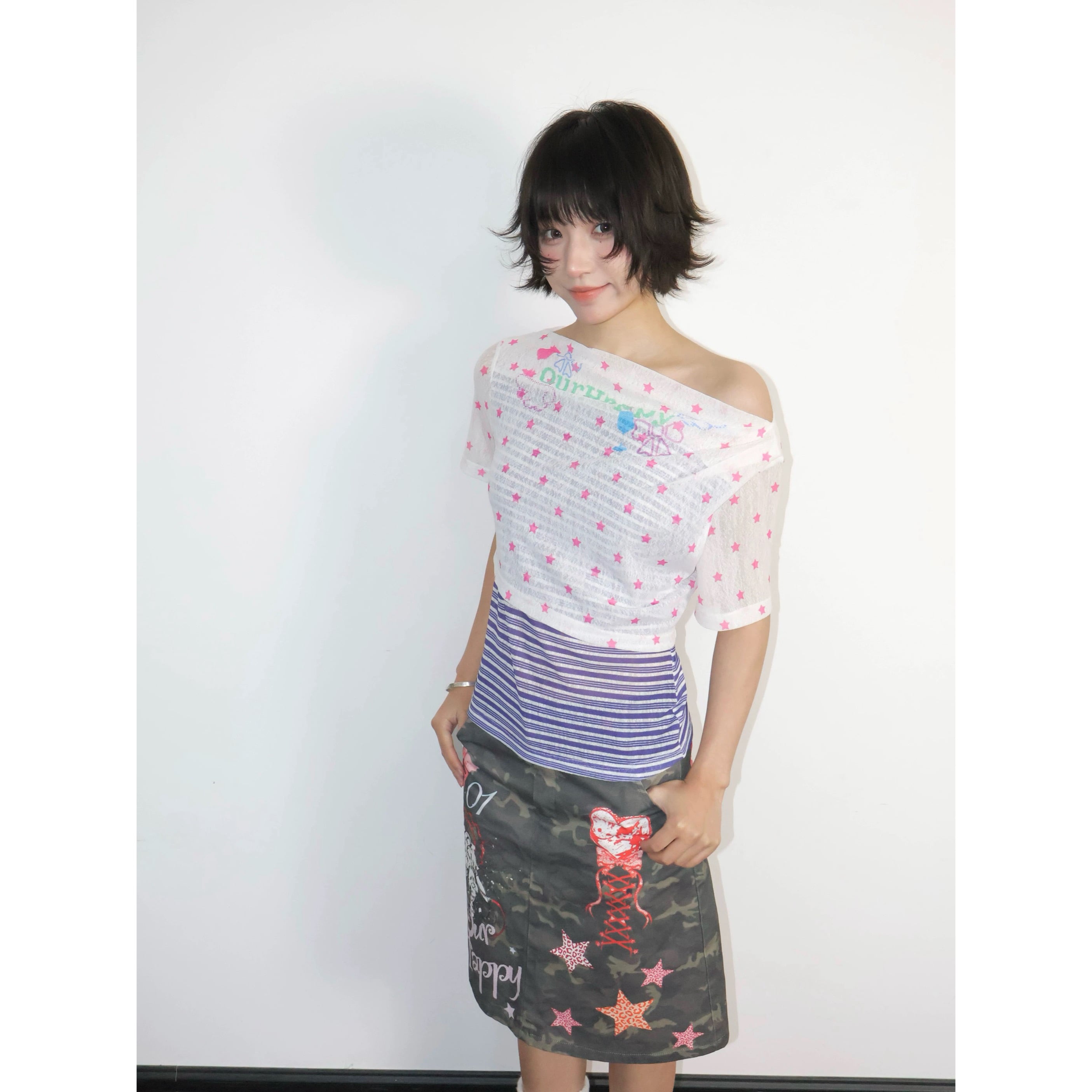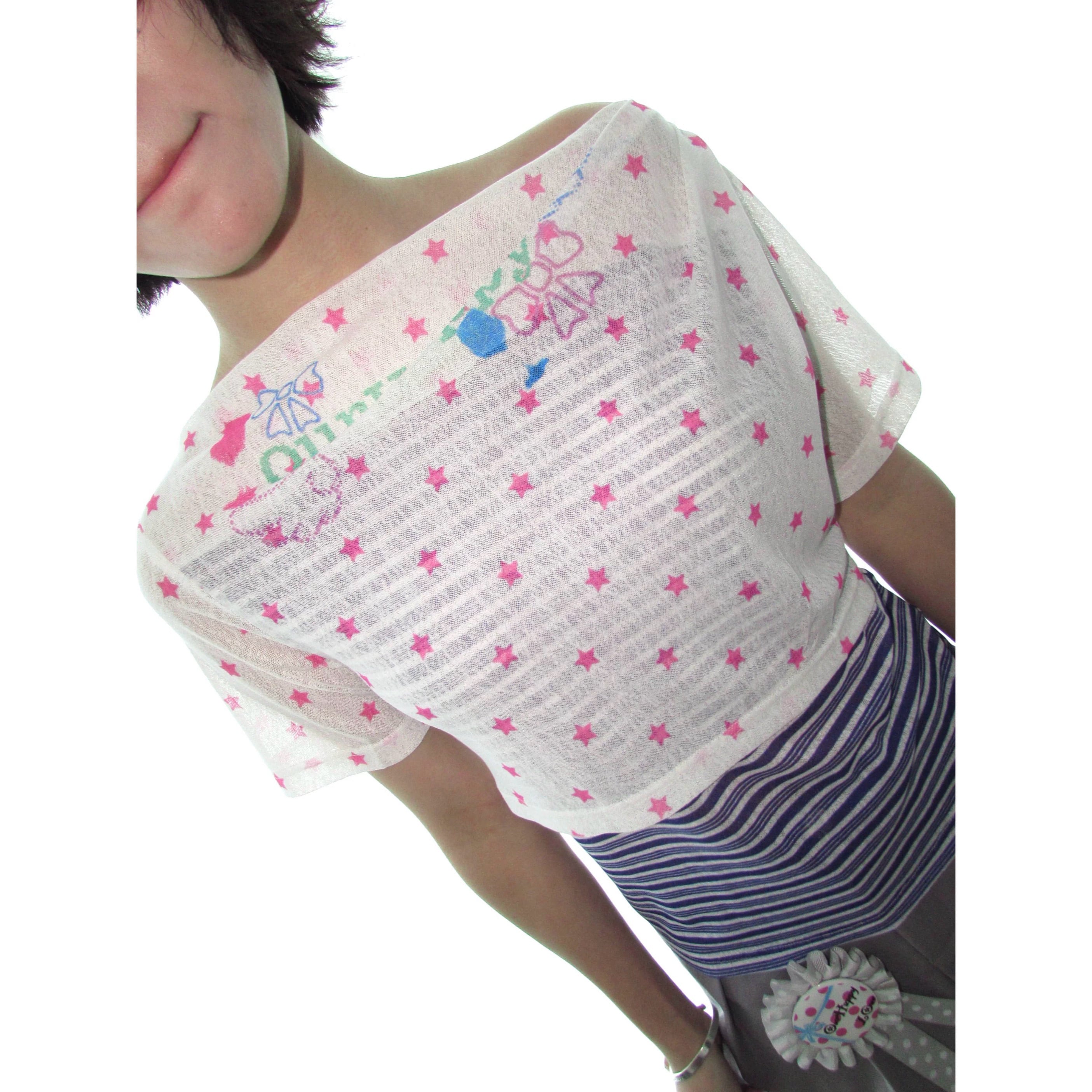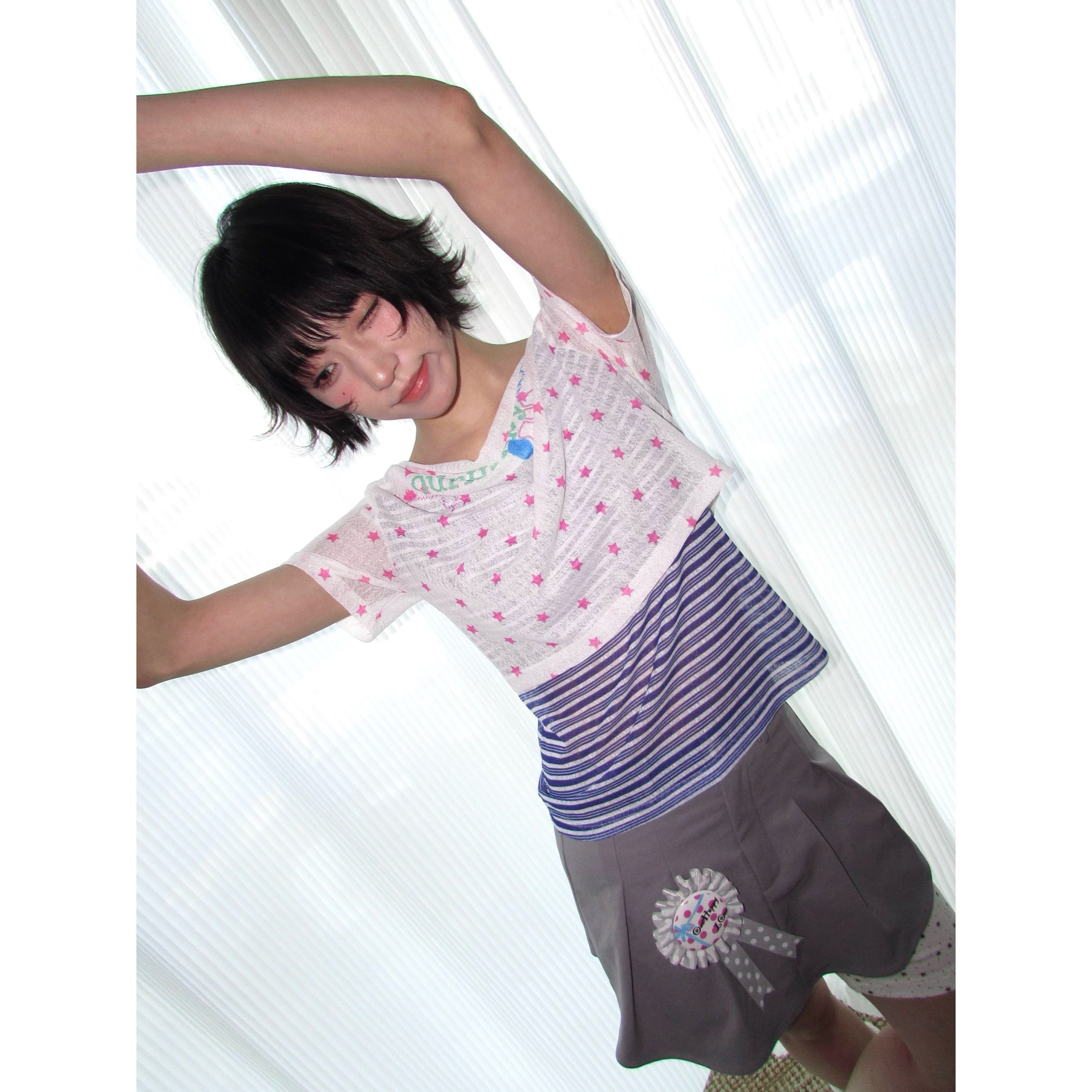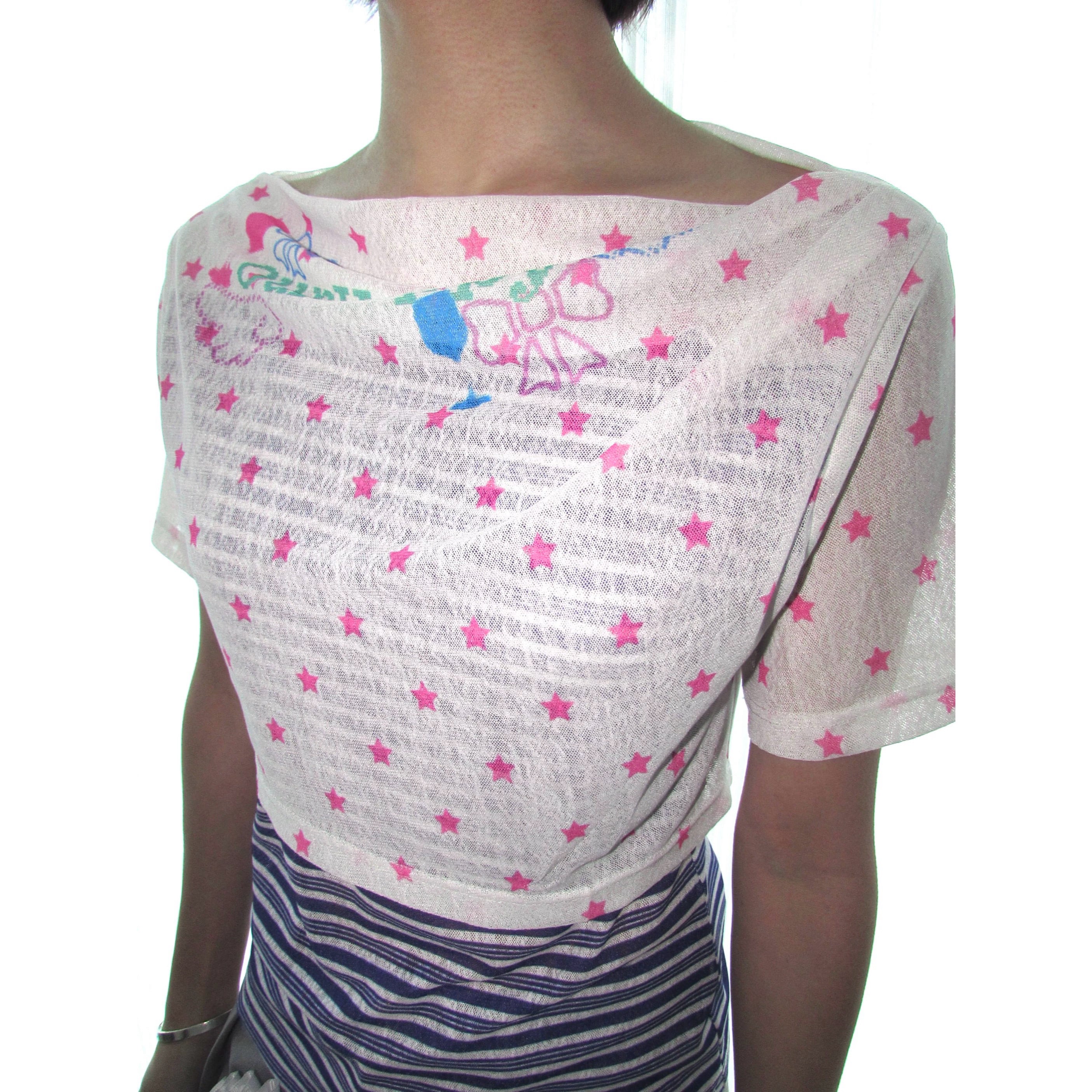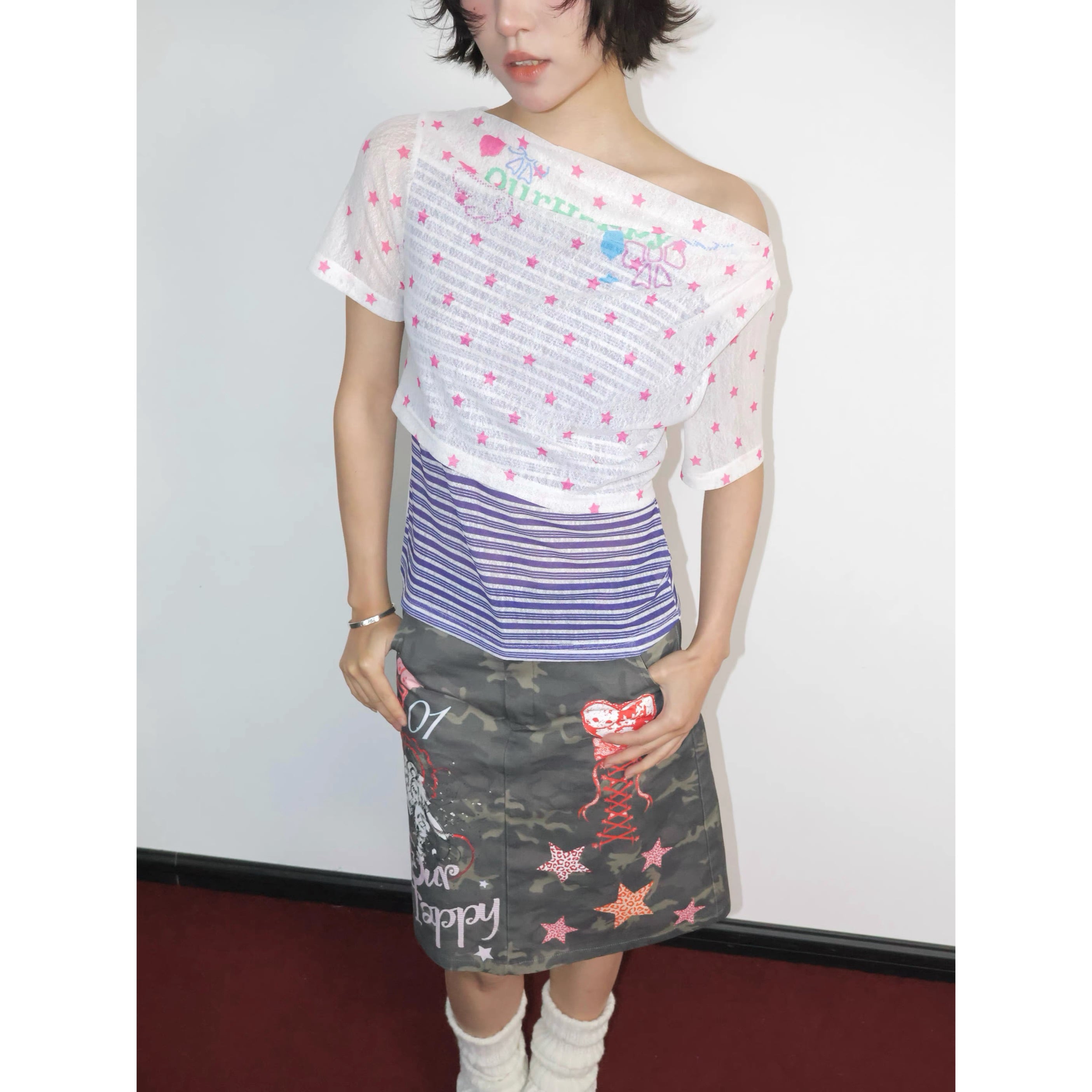 [OurHappy] Stars Mesh One-Collar Short Sleeve Top