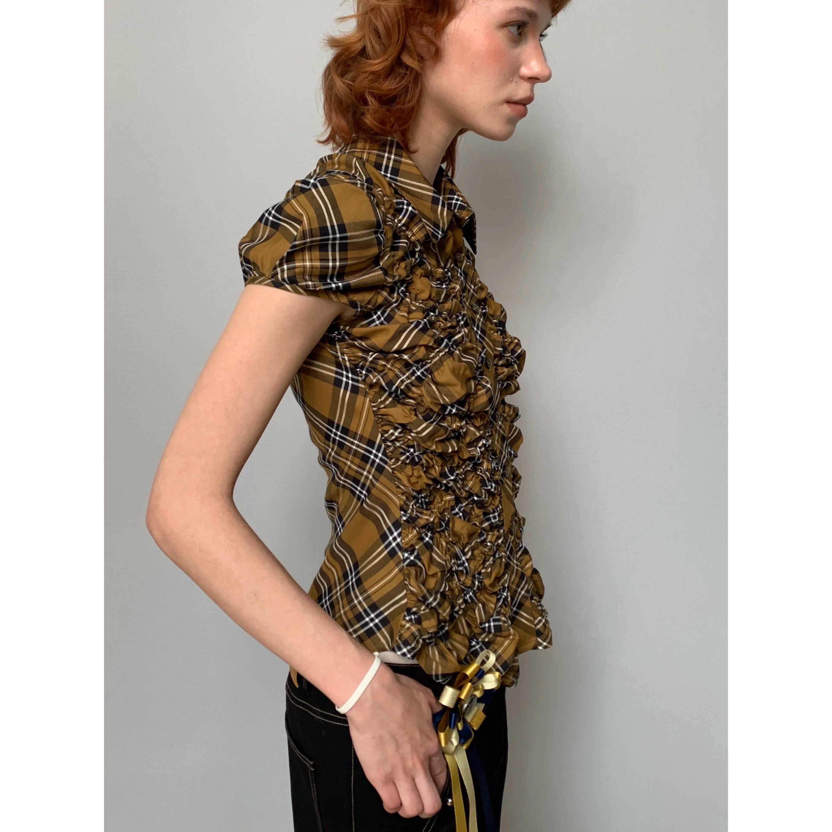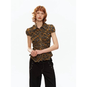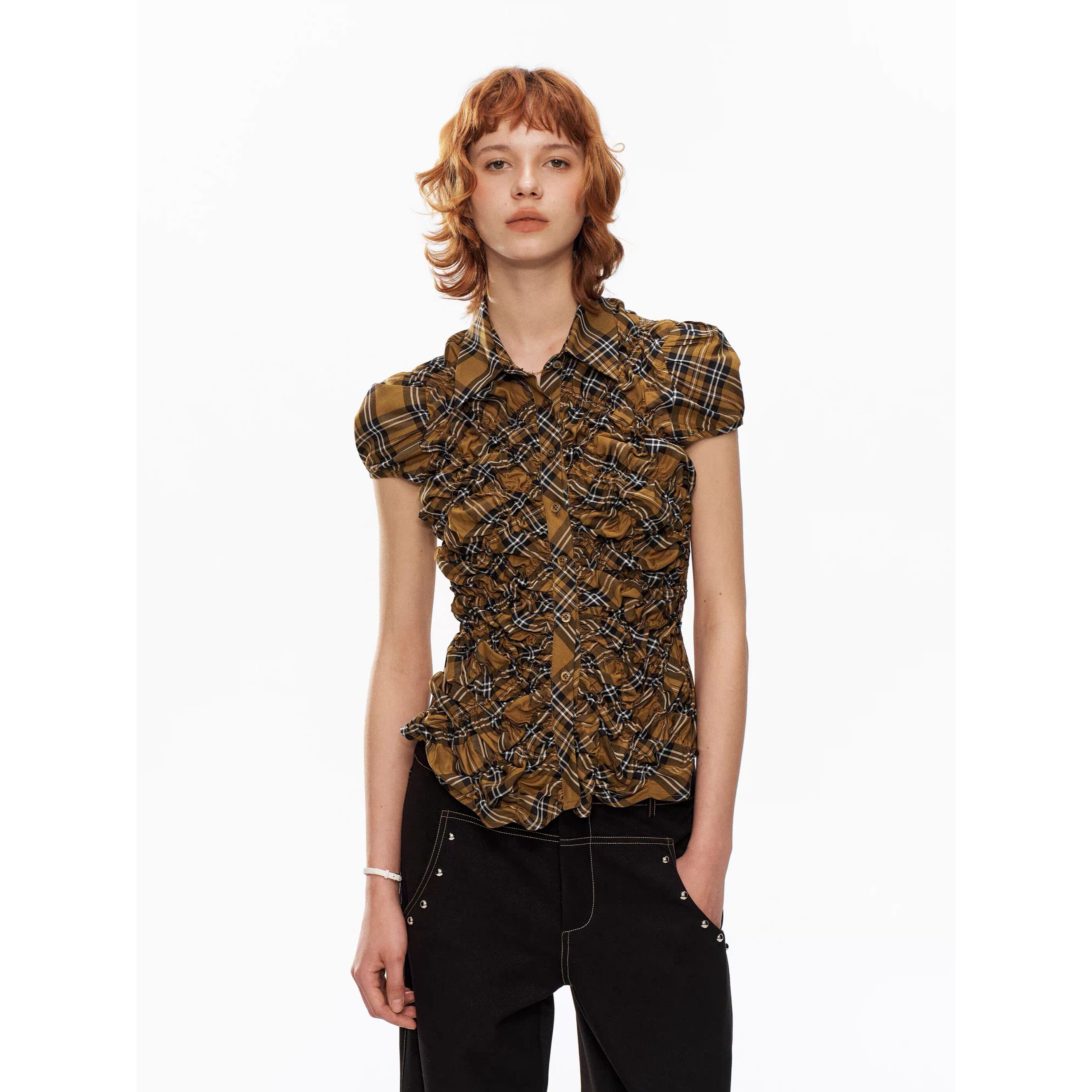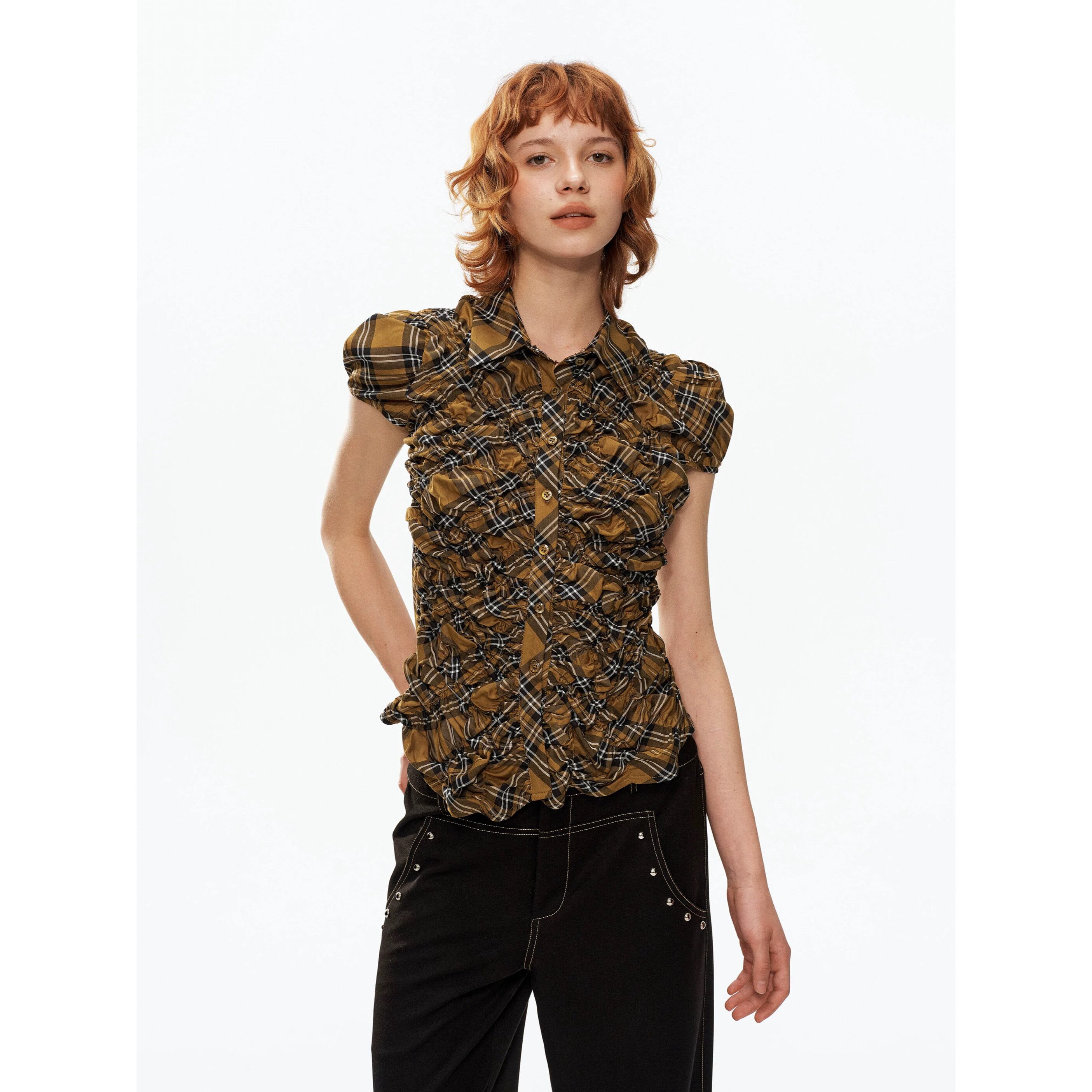 [YOSHUYUKI] Yellow-Black Check Retro Bubble Sleeve Shirt