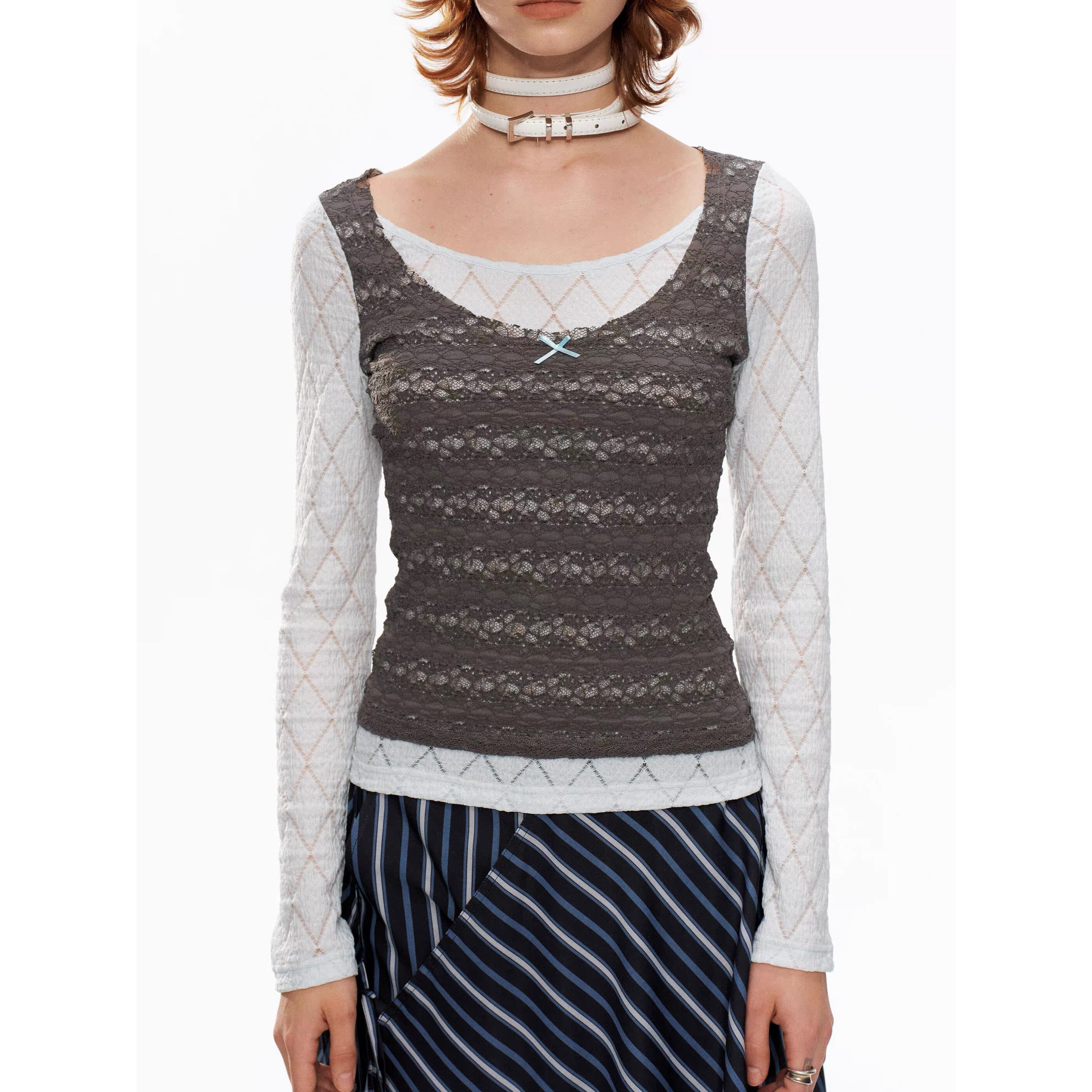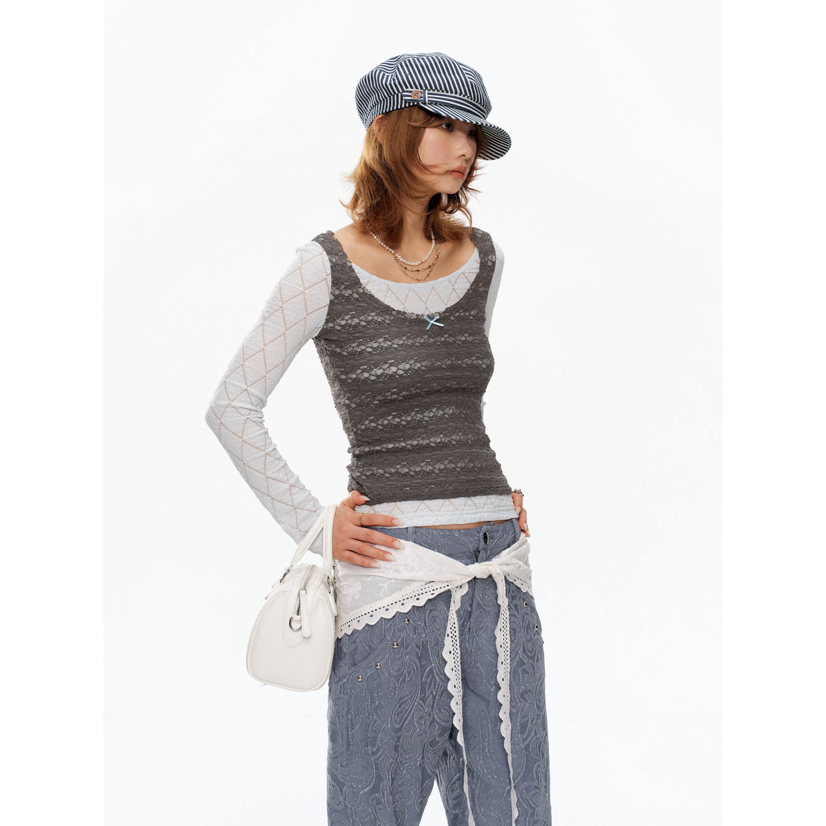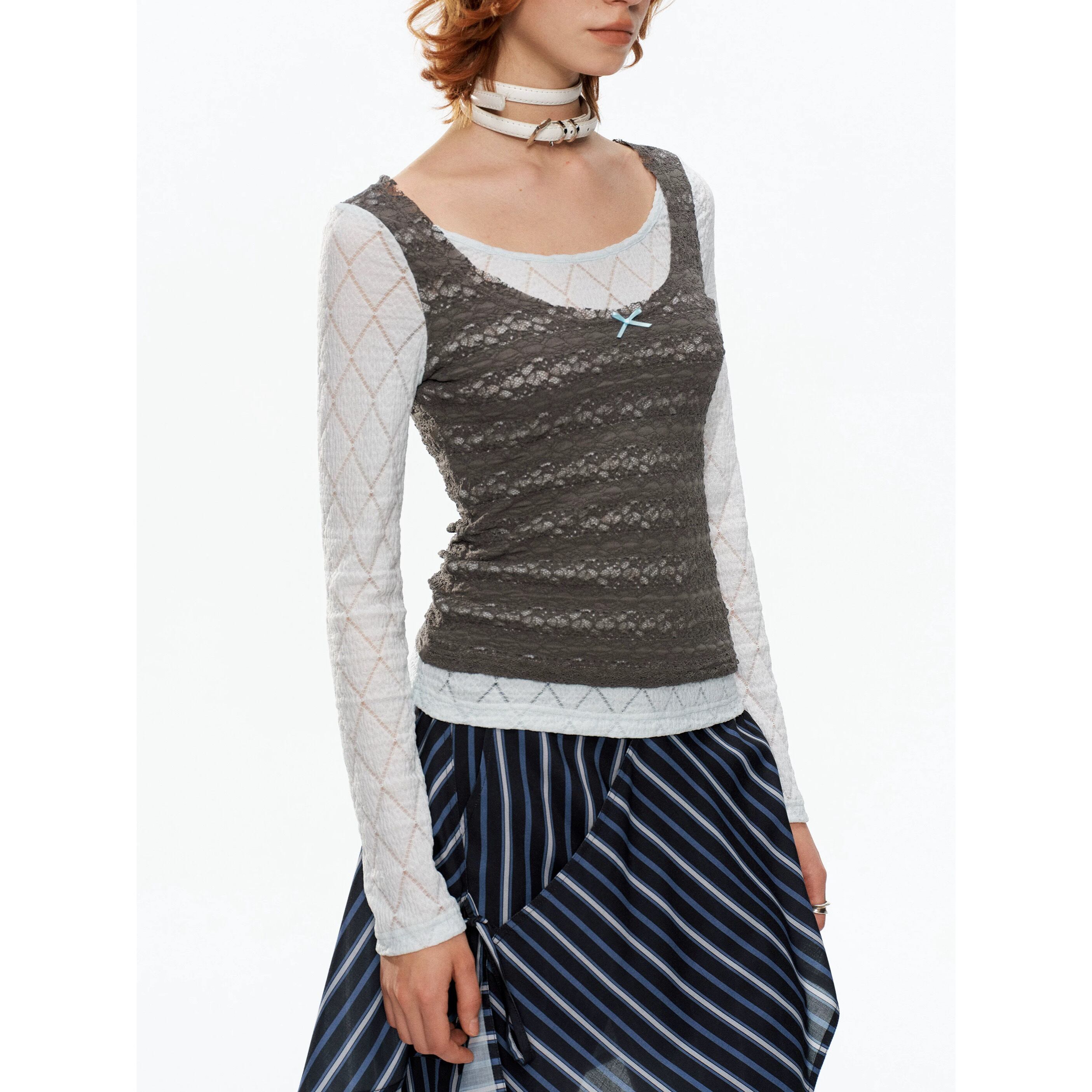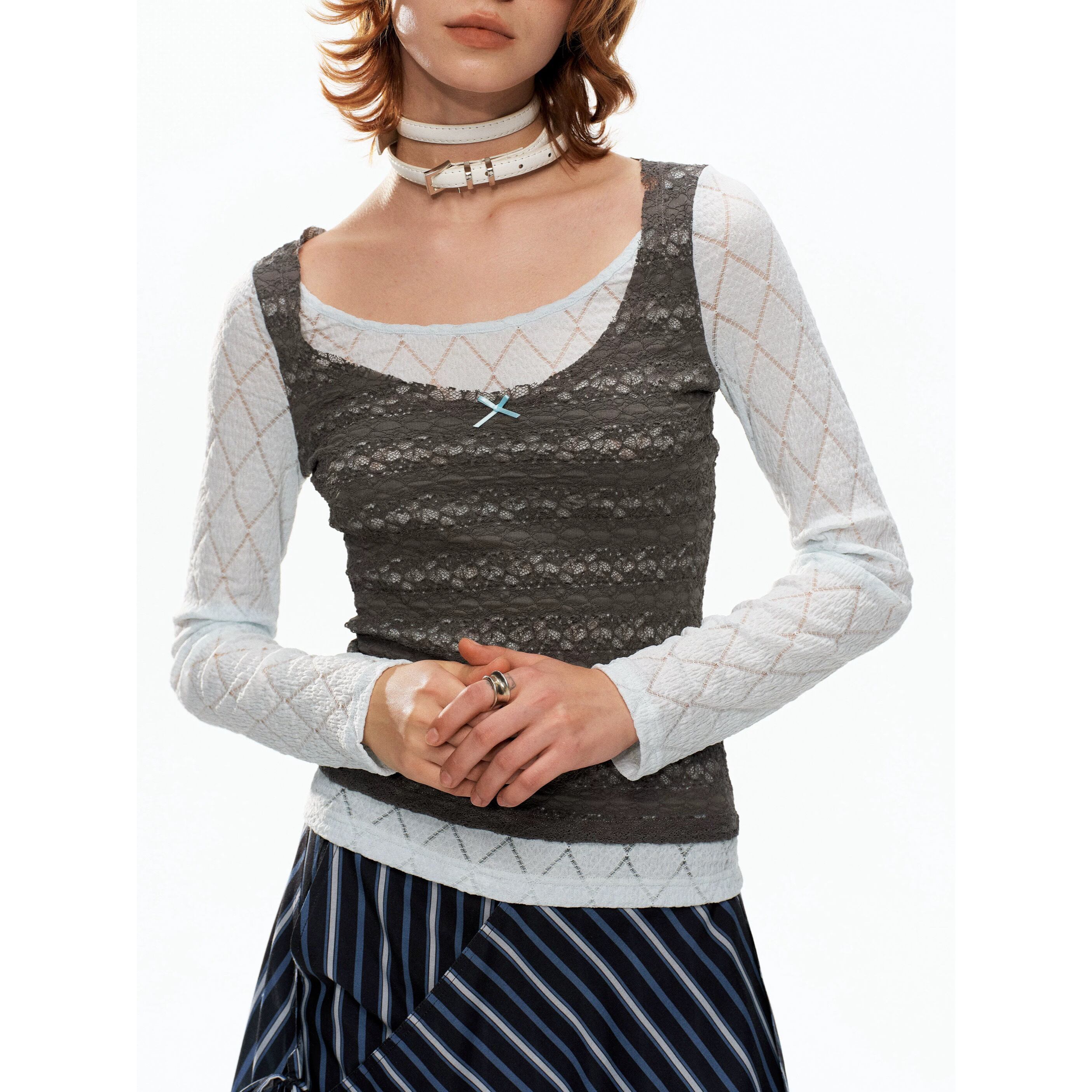 [YOSHUYUKI] blue-gray lace fake two-piece knitted top
