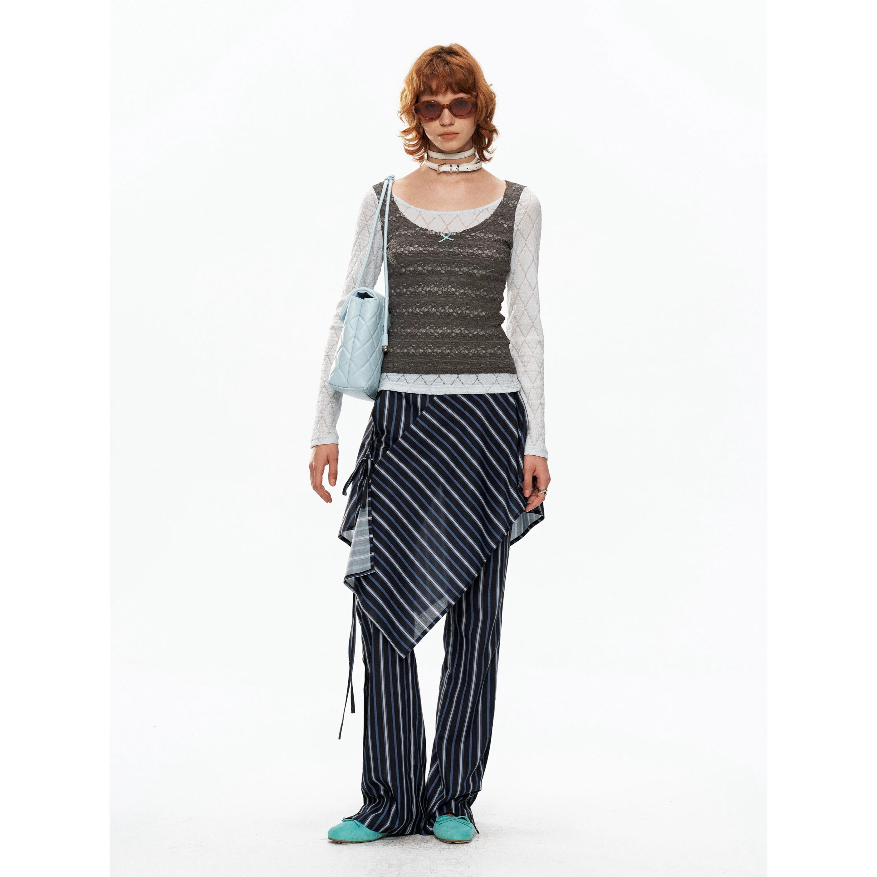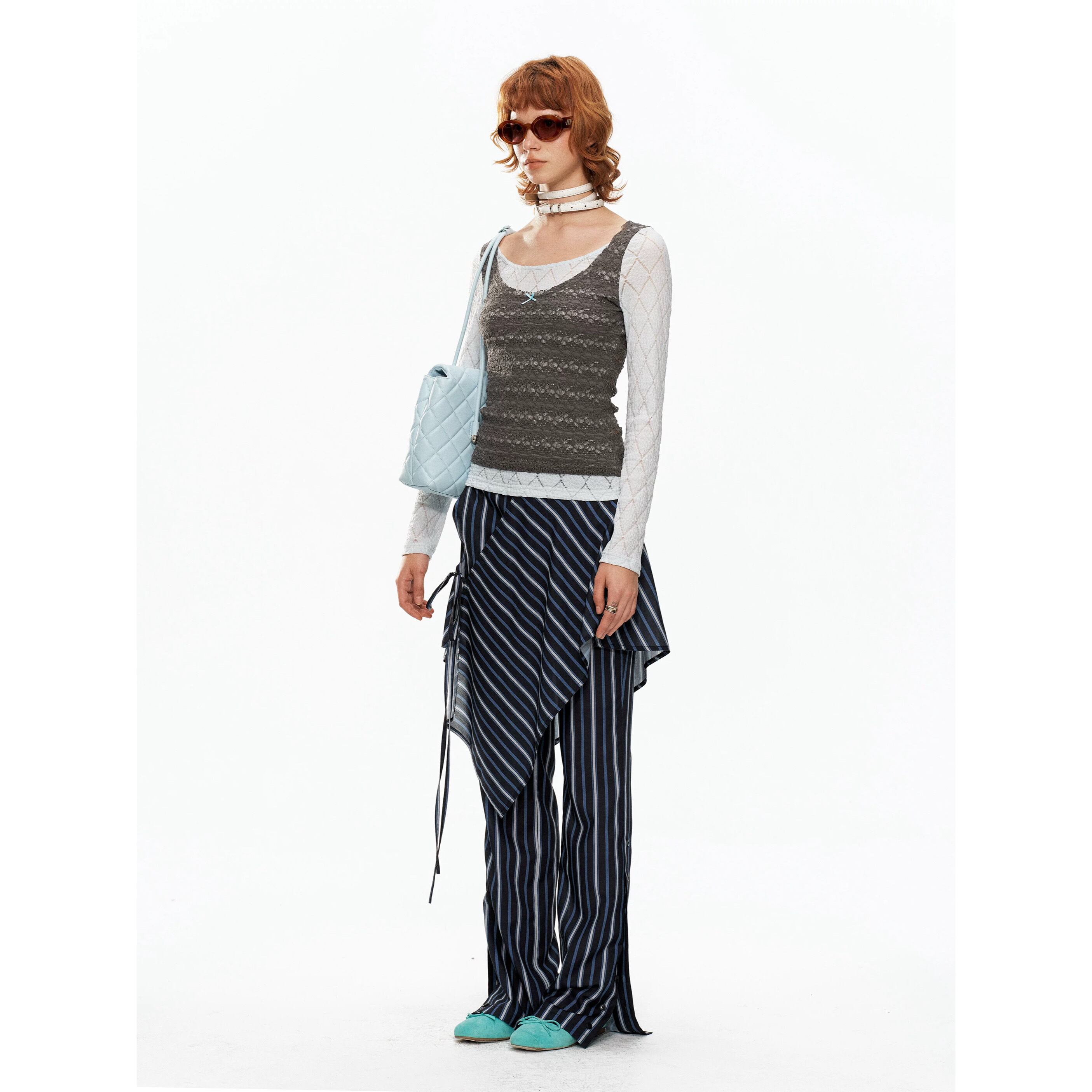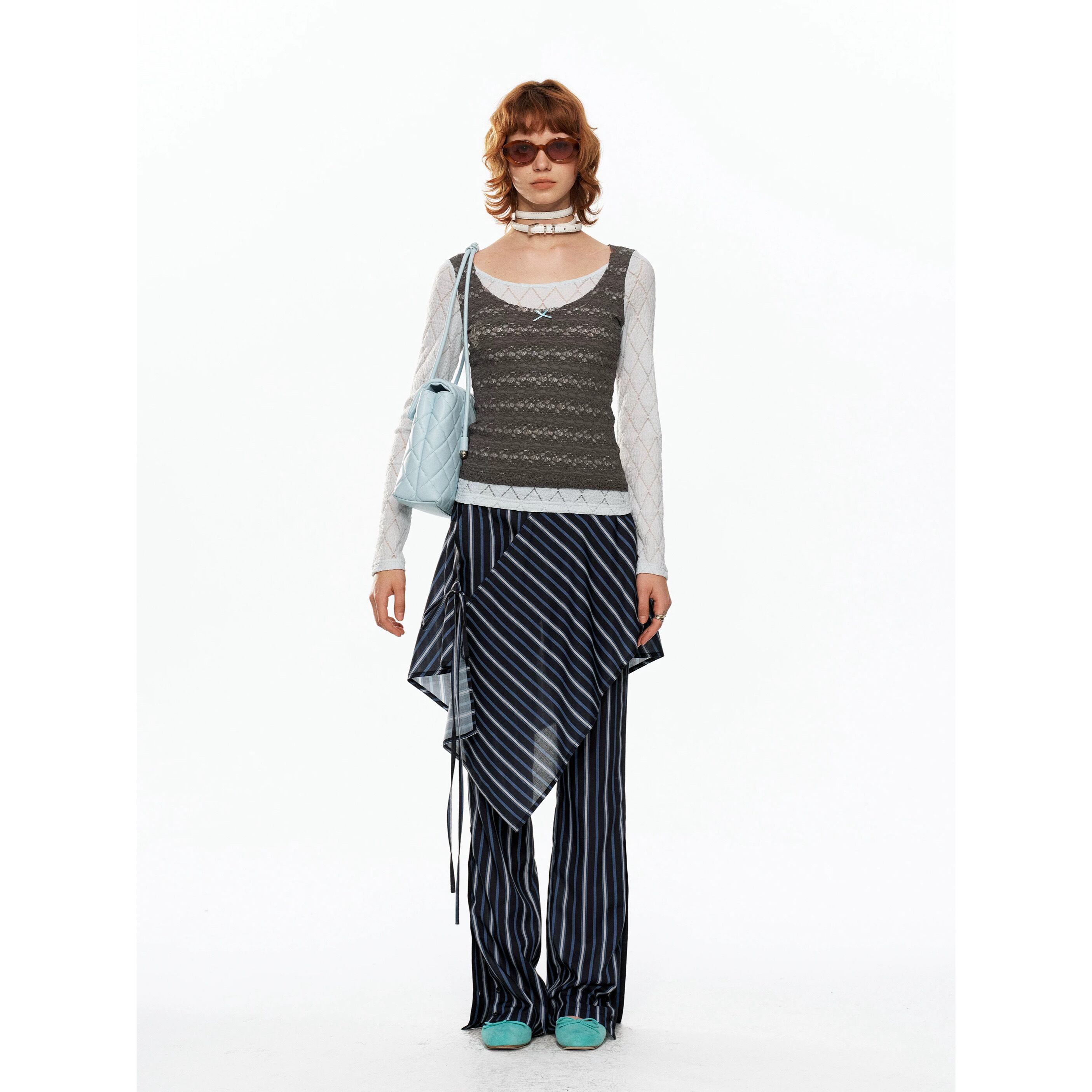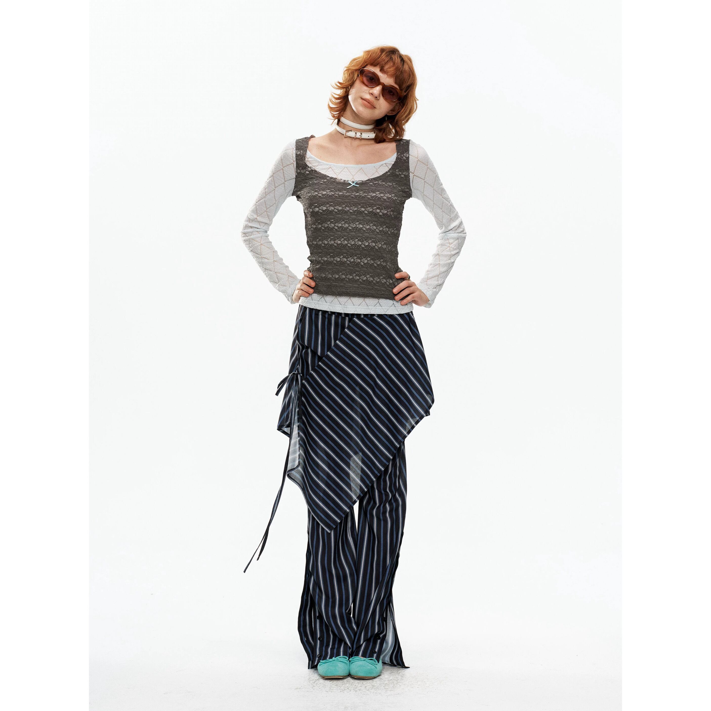 [YOSHUYUKI] blue-gray lace fake two-piece knitted top