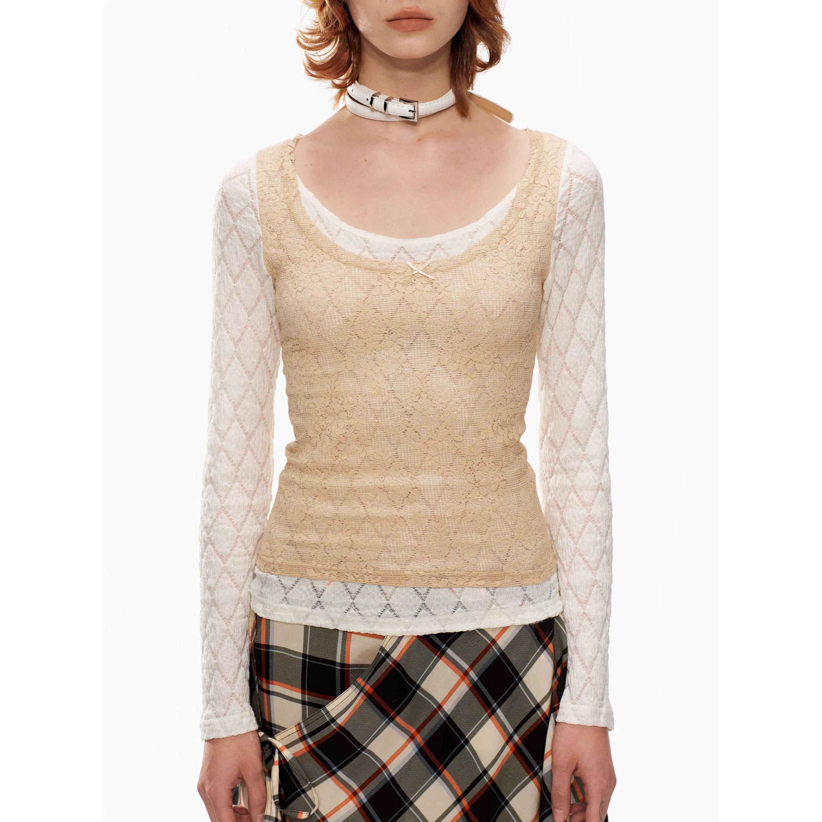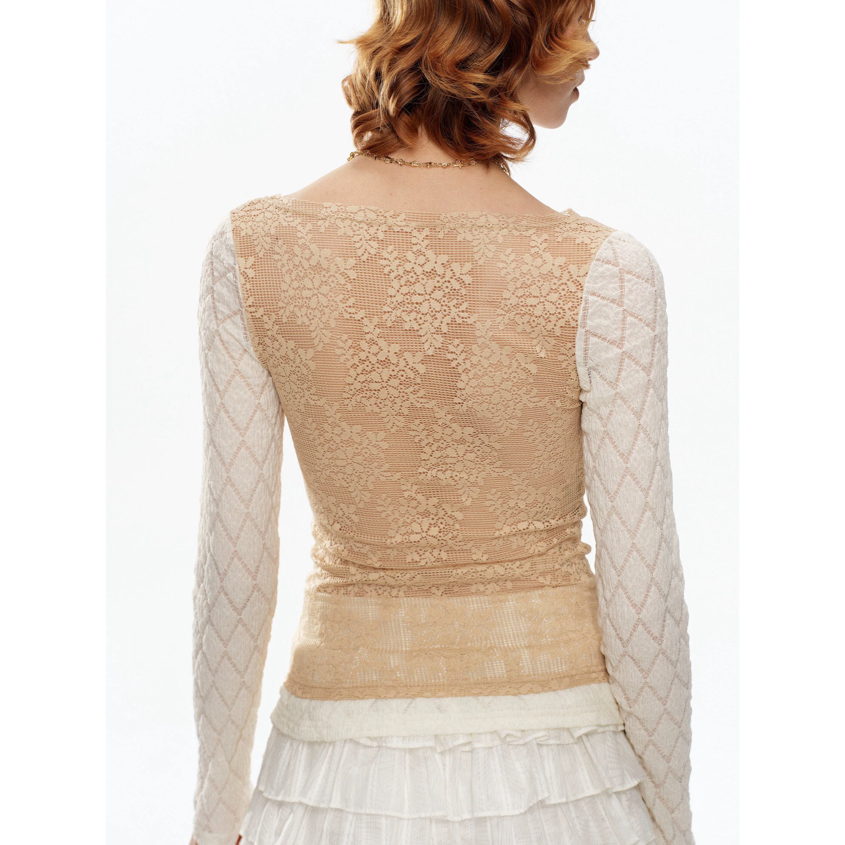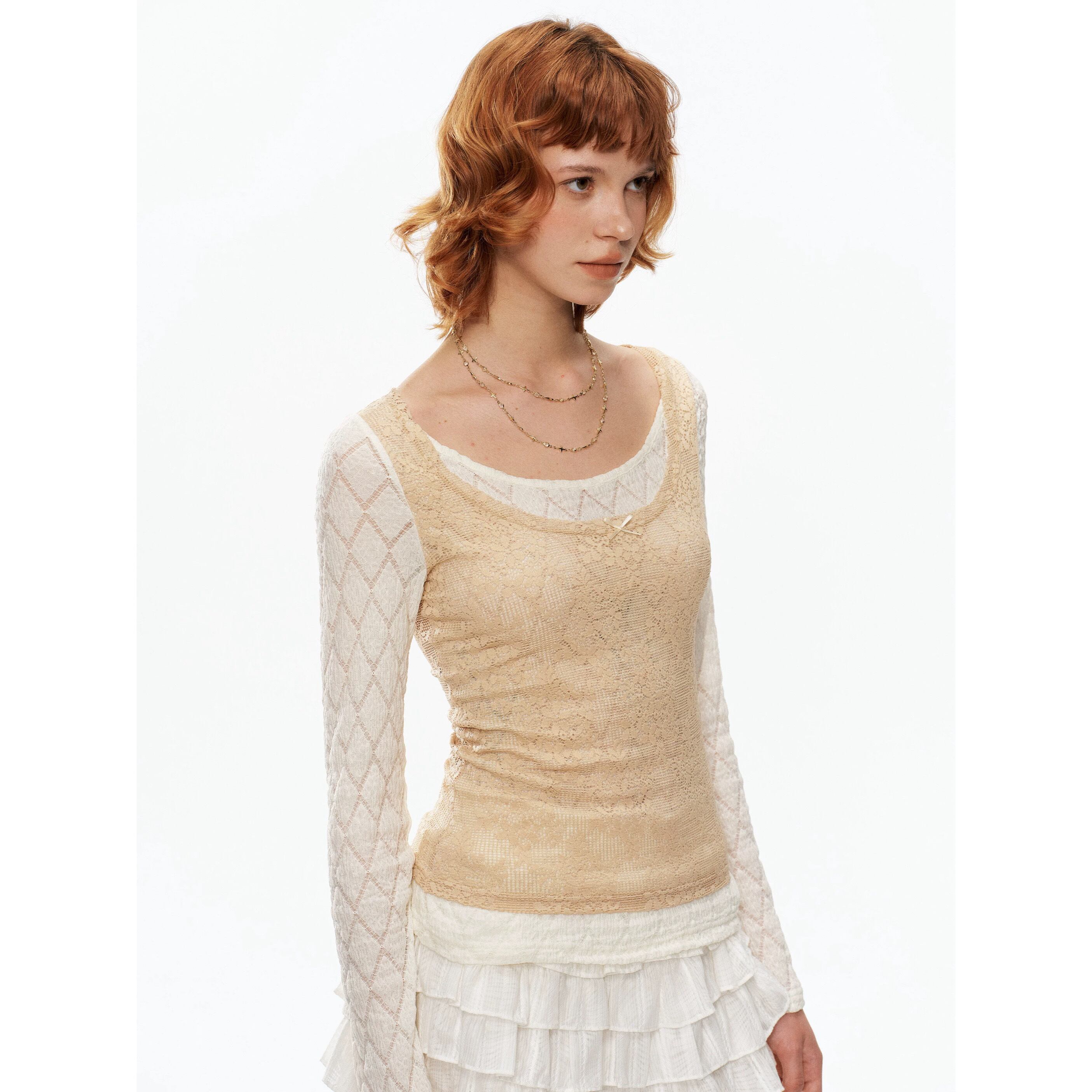 [YOSHUYUKI] beige lace fake two-piece knitted top