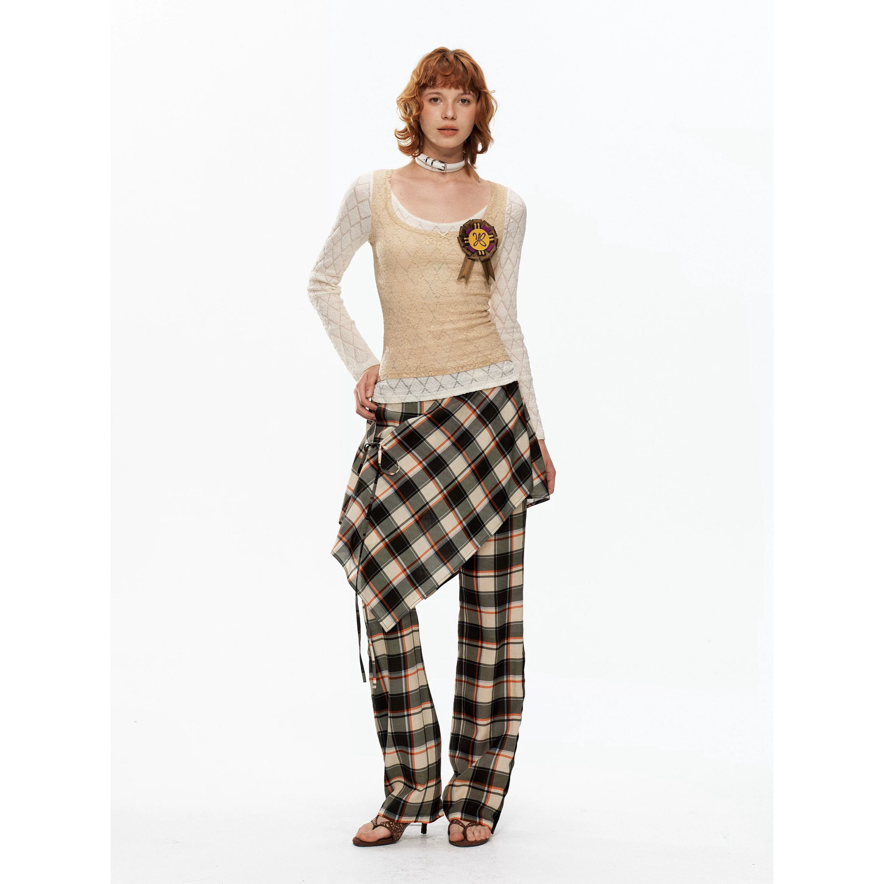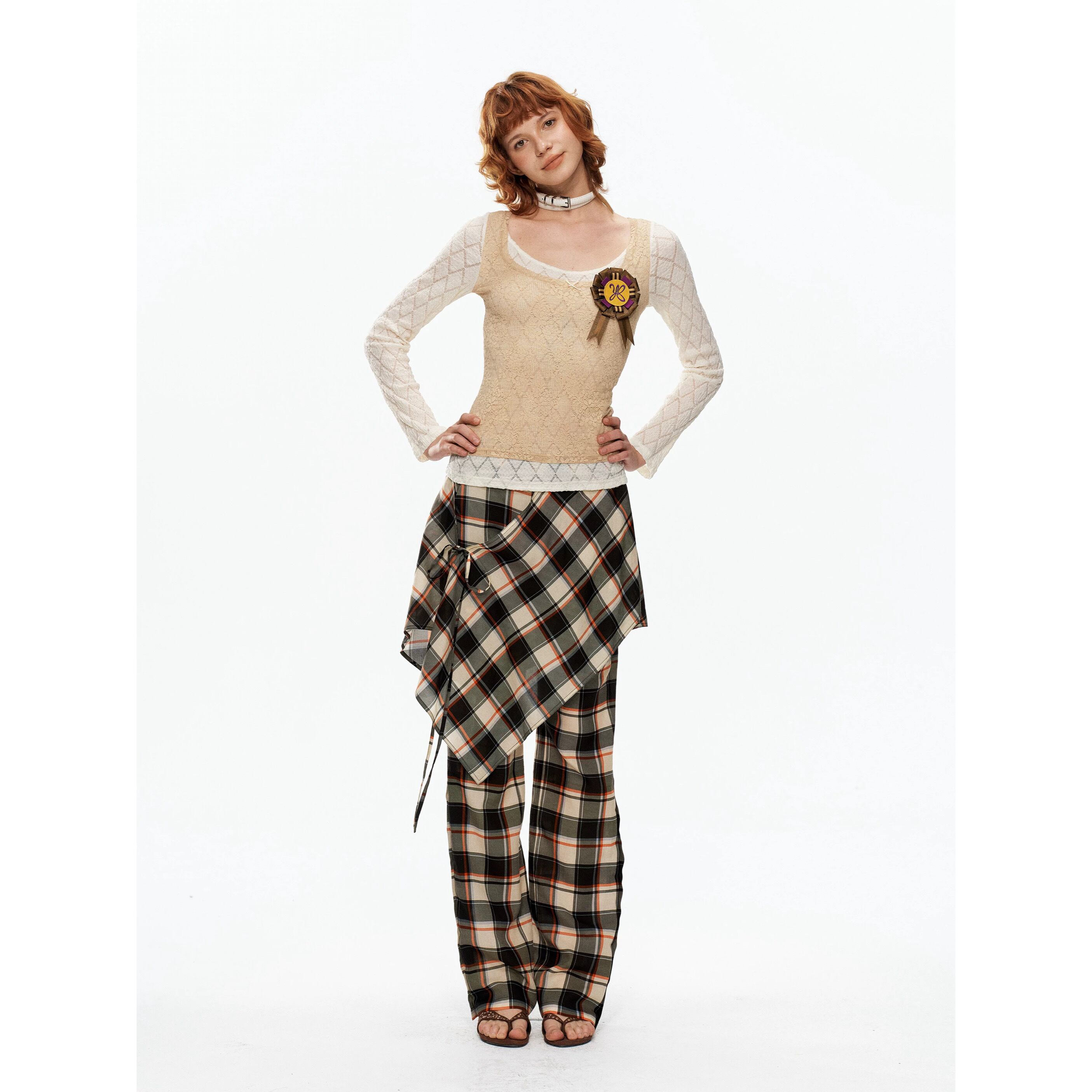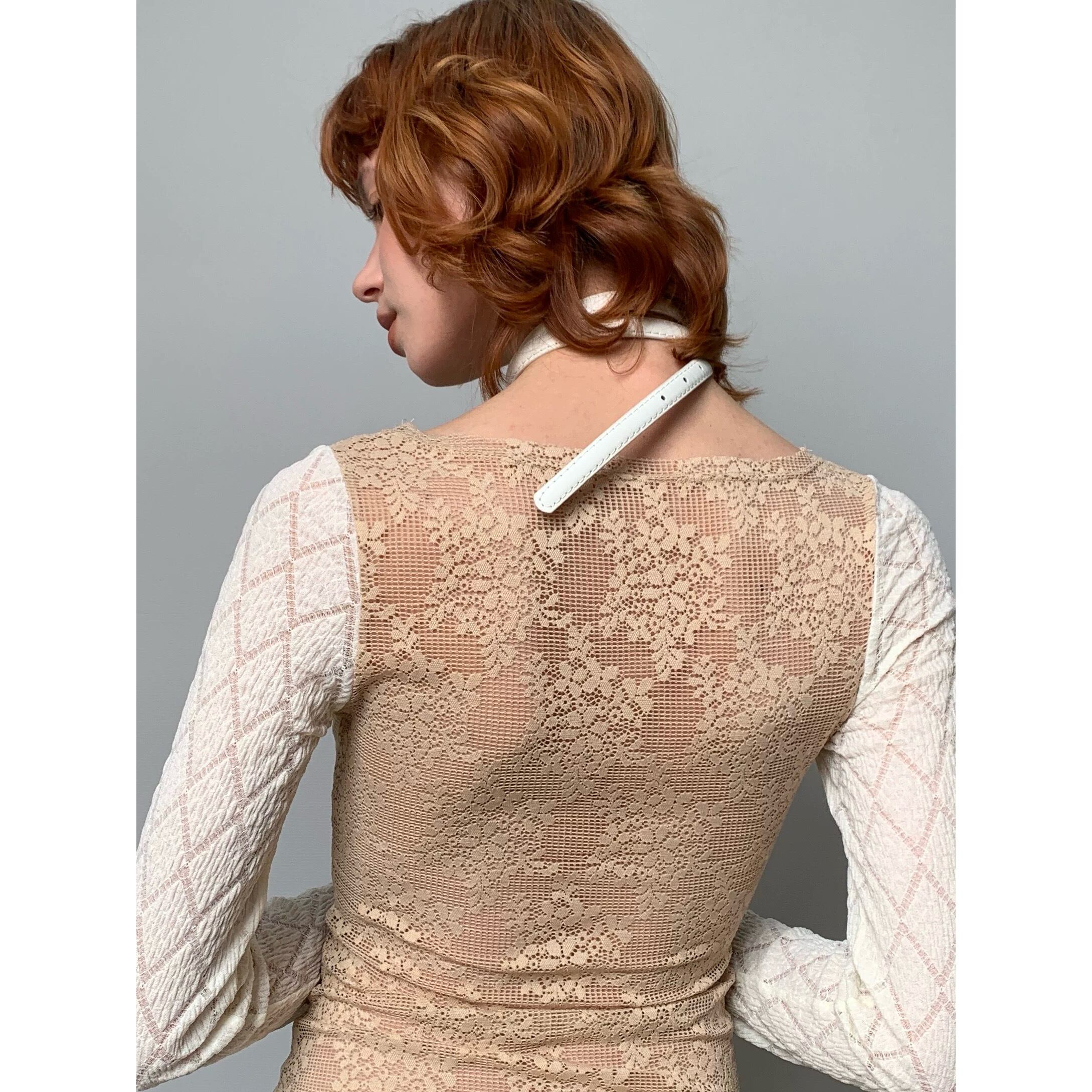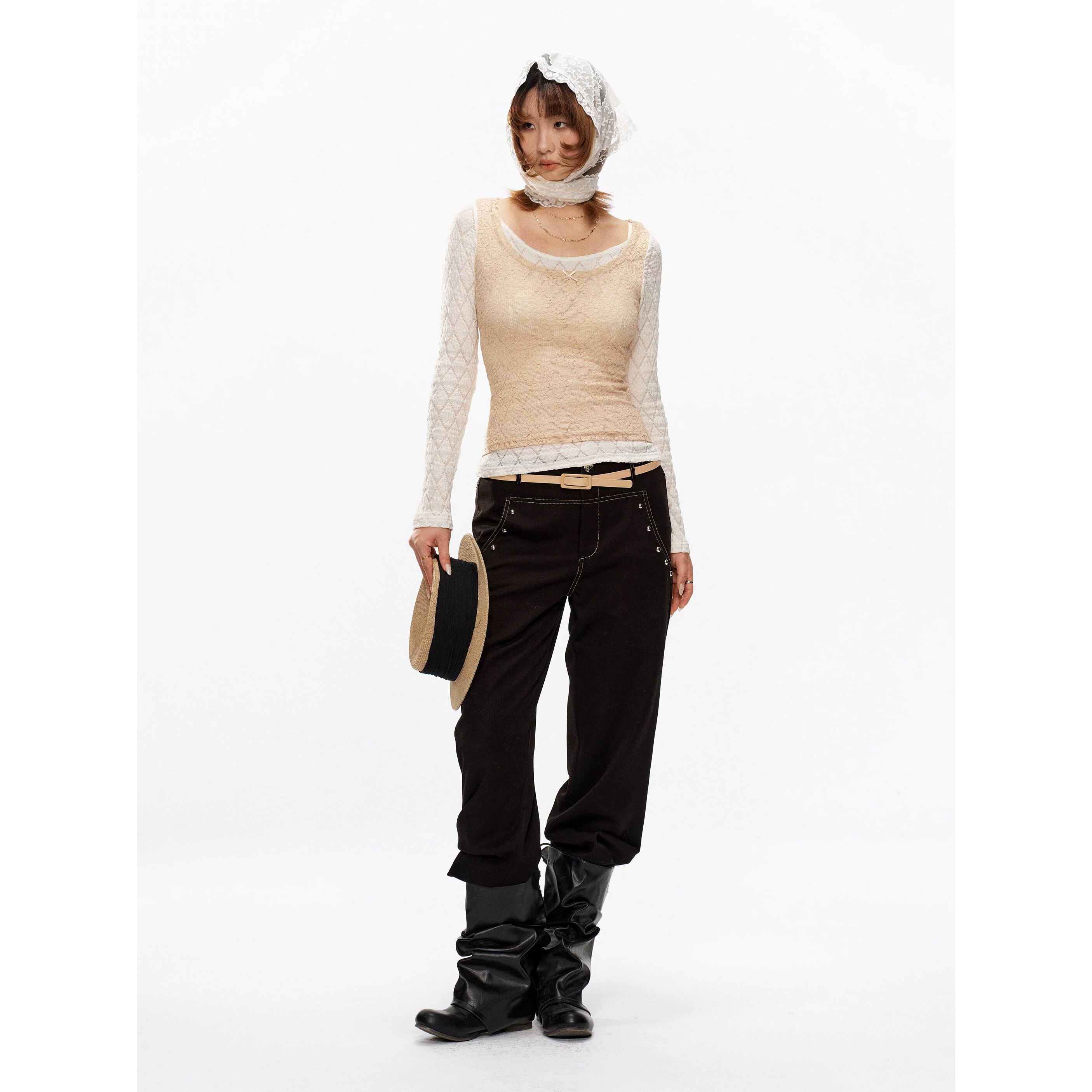 [YOSHUYUKI] beige lace fake two-piece knitted top