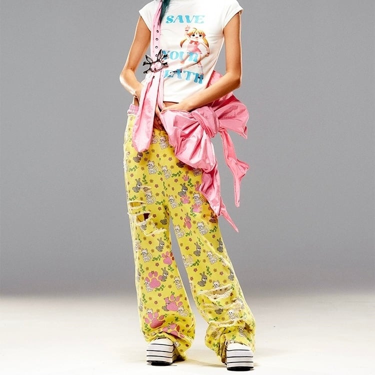 [CFIERCE] Cat and Rabbit Printed Broken Jeans
